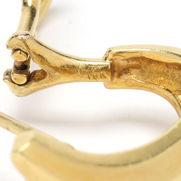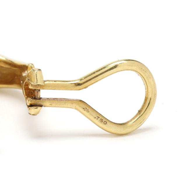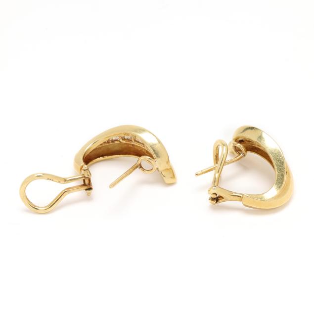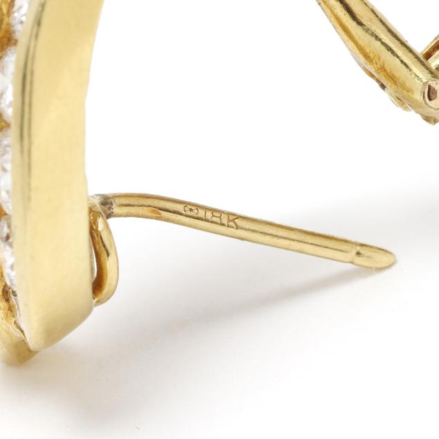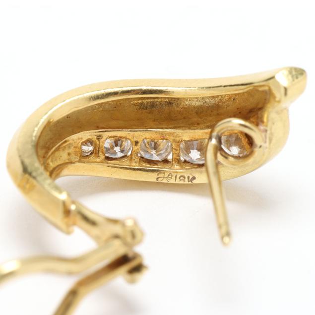 The gold J-hook earrings channel set with full cut round diamonds weighing approximately .84 total carats (H-I color, VS2-SI1 clarity), completed with a post and omega clip backs, stamped with a maker's mark and 18K.