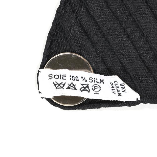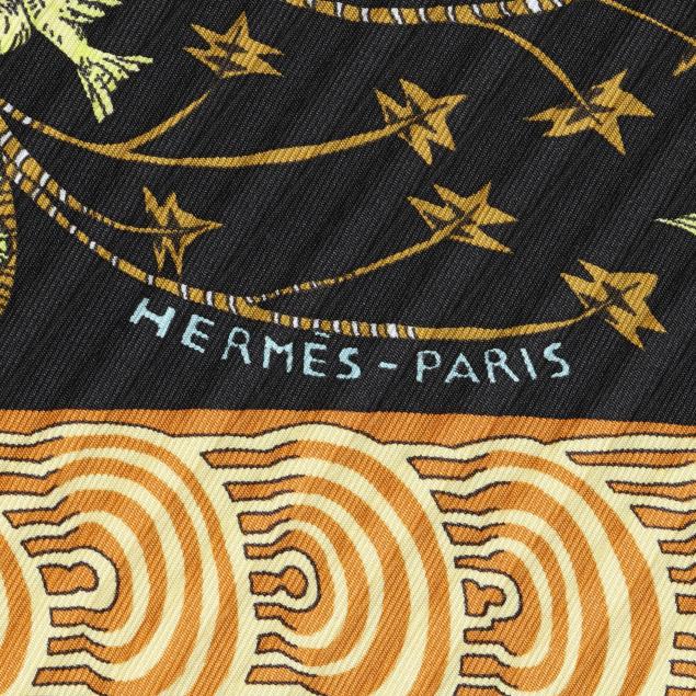 Designed by artist Annie Faivre, the silk twill with rolled and hand stitched edges, with a color palette of black, yellow, and orange, and with care tag.