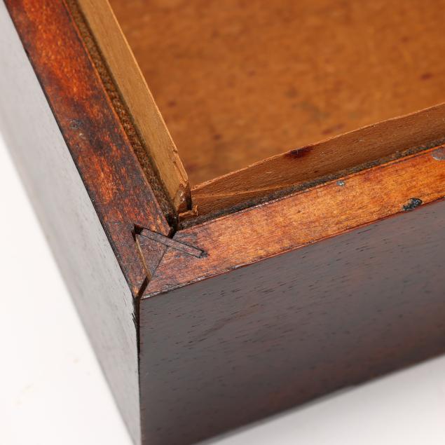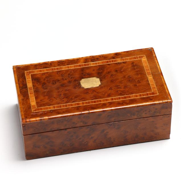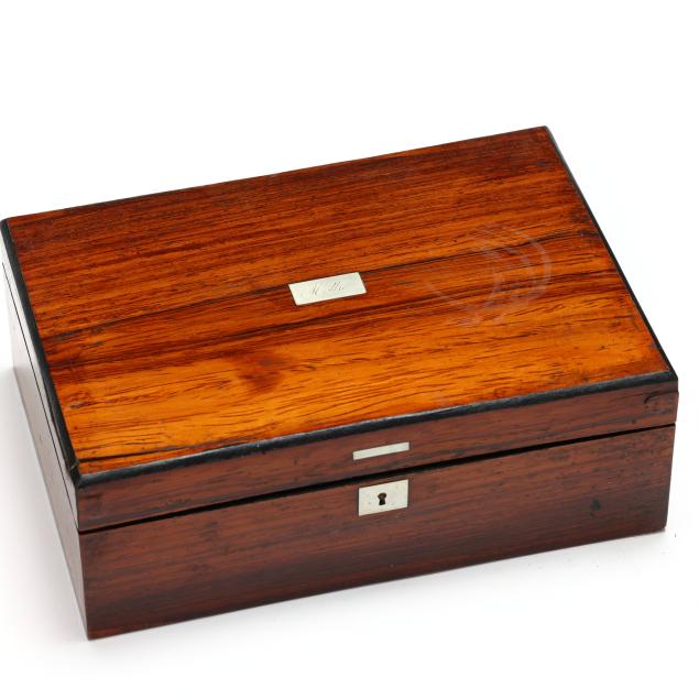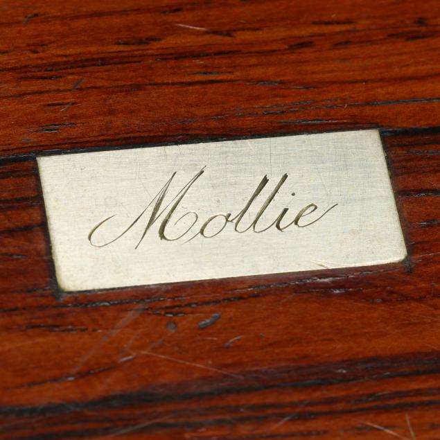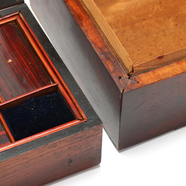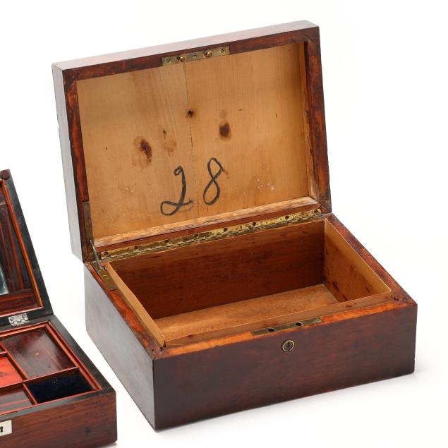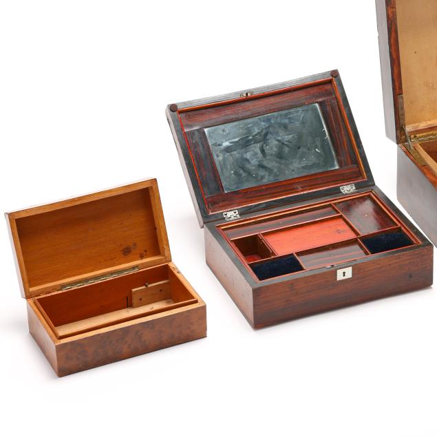 19th century, rectangular forms with hinged lids, unmarked, the largest in rosewood veneers, with brass plaque mount and removable mahogany lined open interior (5 x 11 1/4 x 8 1/4 in.); the second a jewelry or sewing box in rosewood veneers with inlaid silver toned escutcheon and plaque engraved "Mollie," opens to removable upper tray to the interior with faux grained panels (3 1/2 x 9 1/2 x 6 1/2 in.); the smallest in burl veneers with kingwood and satinwood inlays, and inlaid brass cartouche, open interior (2 3/4 x 7 1/2 x 4 1/4 in.).