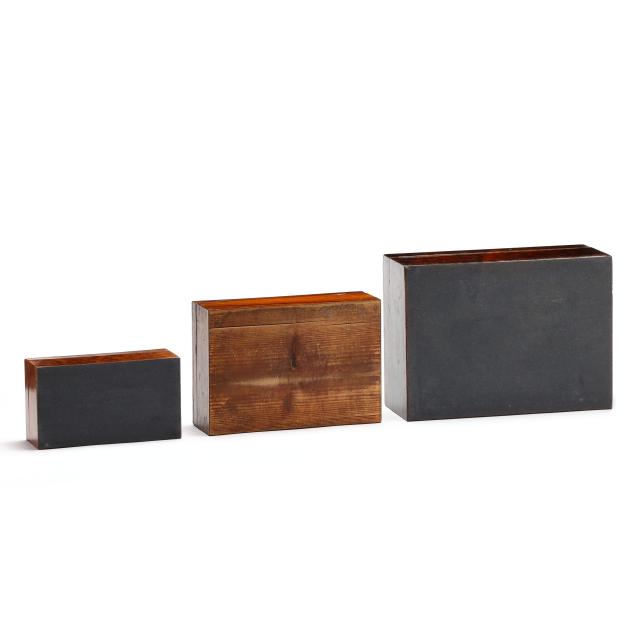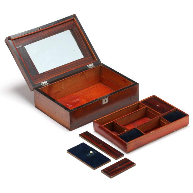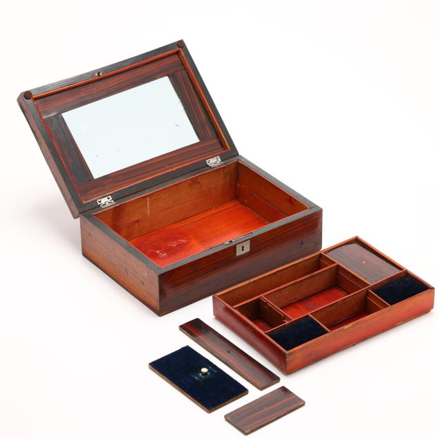 From the Estate of the late Patricia W. Capps, Winston Salem, North Carolina Each with some areas of surface scratching, veneer cracks, and small areas of veneer loss; the jewelry box panels missing pulls and small areas of panel loss; largest with chipping to interior liner; without keys.