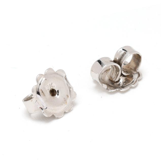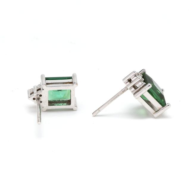 The white gold stud earrings set with rectangular cut tourmalines (6.95 x 6.12 x 4.23mm; 7.07 x 6.13 x 4.45mm) weighing approximately 5.5 total carats, with trefoil surmount set with full cut round diamond melee, completed with post and friction backs, earrings XRF testing 18KT, backs stamped 18K.