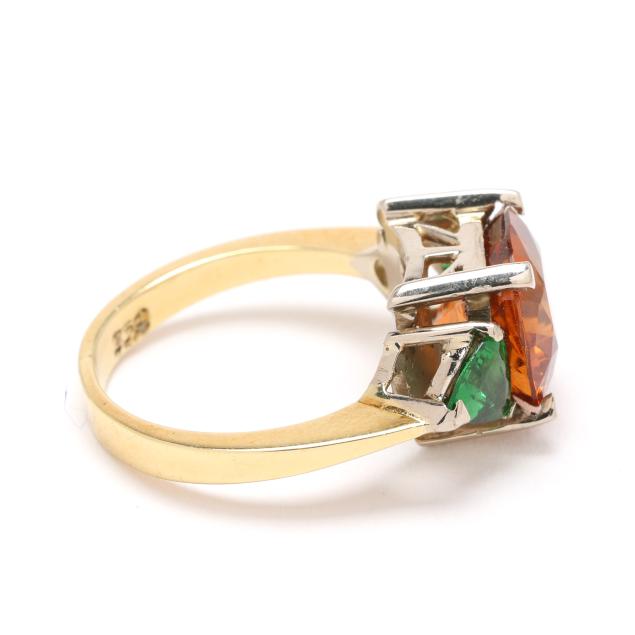 Centered on a cushion cut pyrope-spessartine garnet (10.13 x 10.43 x 6.33mm) weighing approximately 4.50 carats and set to the sides with triangular cut green garnets, stamped 750.