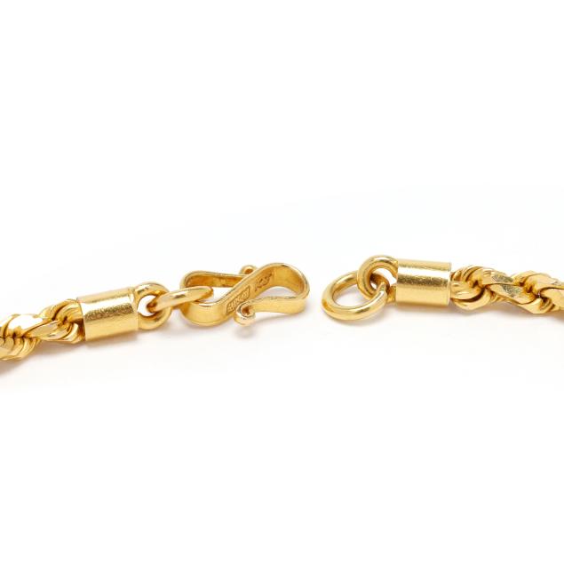 The gold rope twist necklace completed with a hook and eye clasp, stamped with Chinese characters for pure gold and KS, XRF testing 19KT.