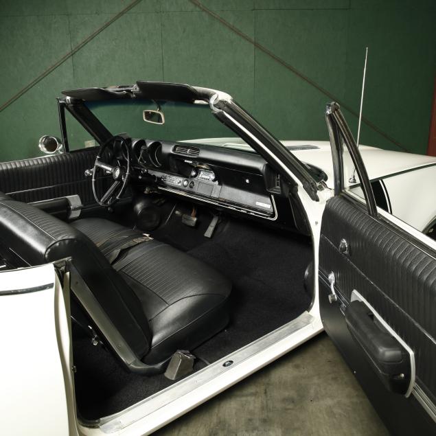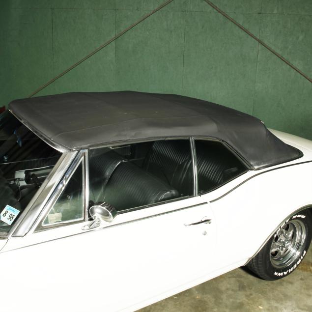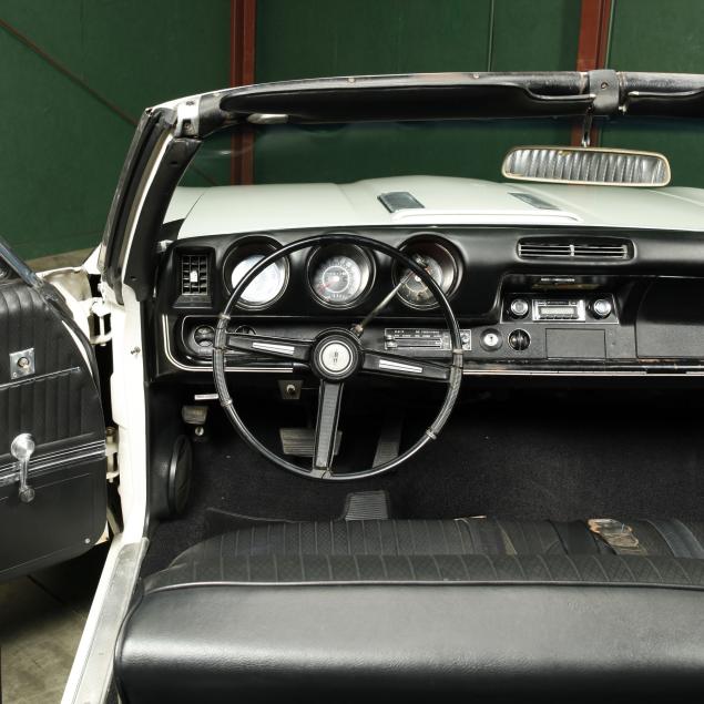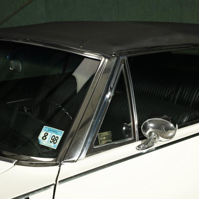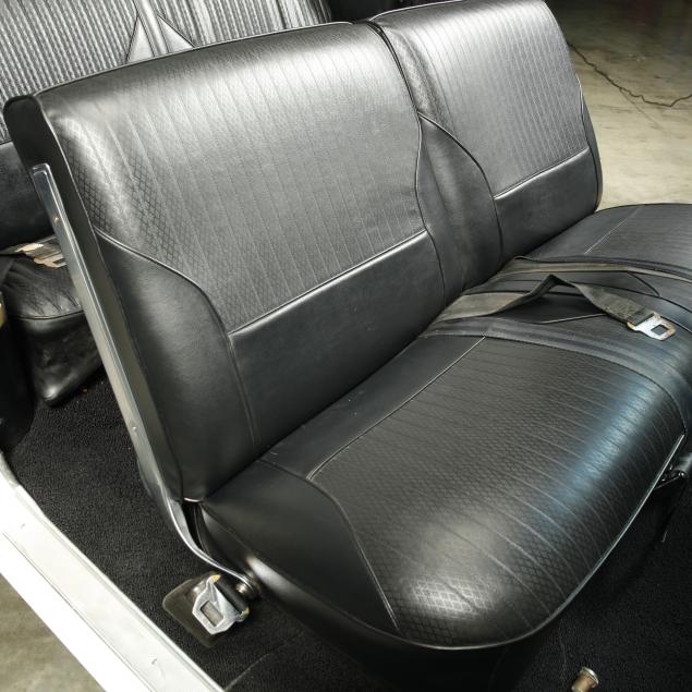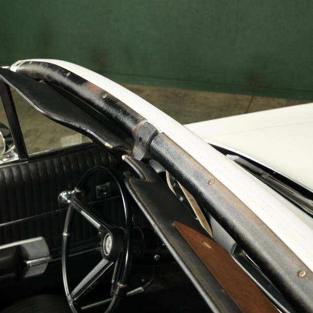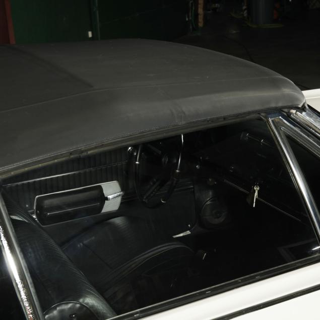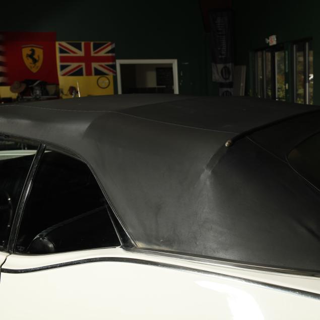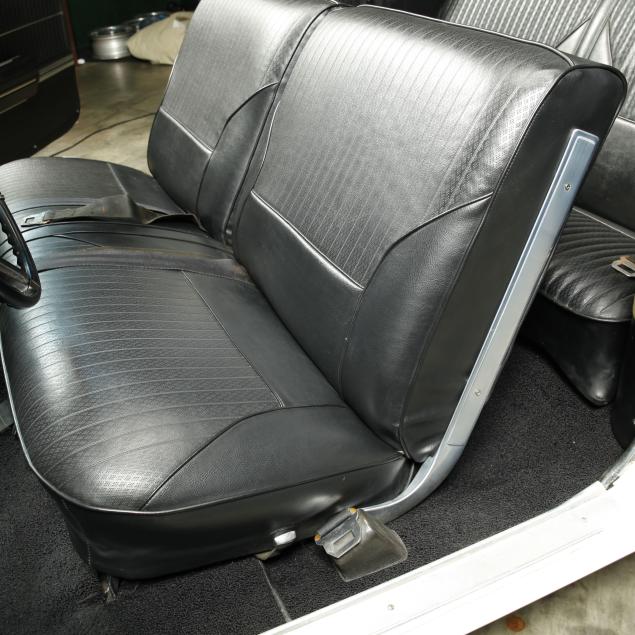 With an exterior repaint in the original Provincial White, with a black cloth top that appears to be a replacement. The interior presents a bench seat that has been recovered along with the front door panels and armrests, with the original rear side panels and rear seat vinyl. Replacements are present.