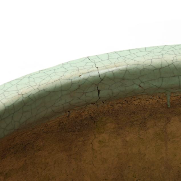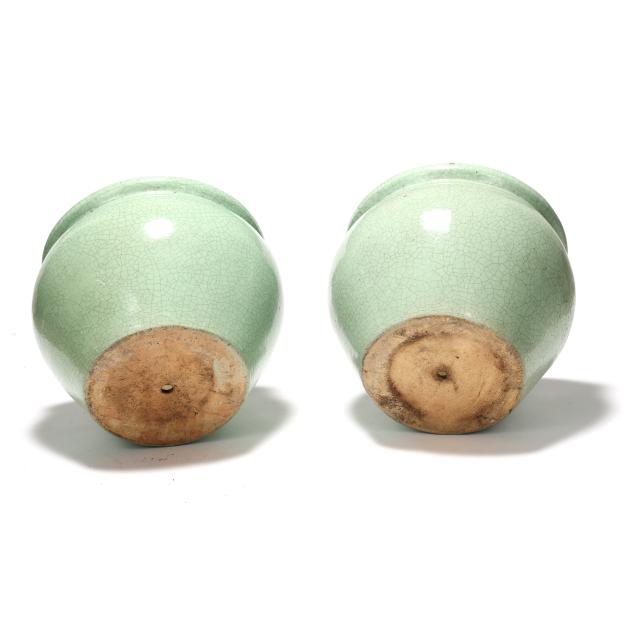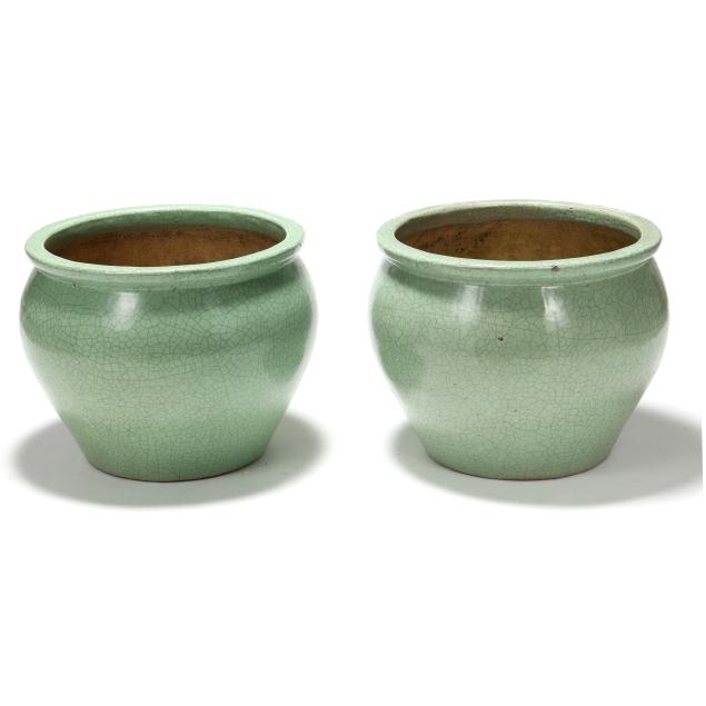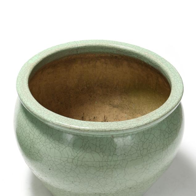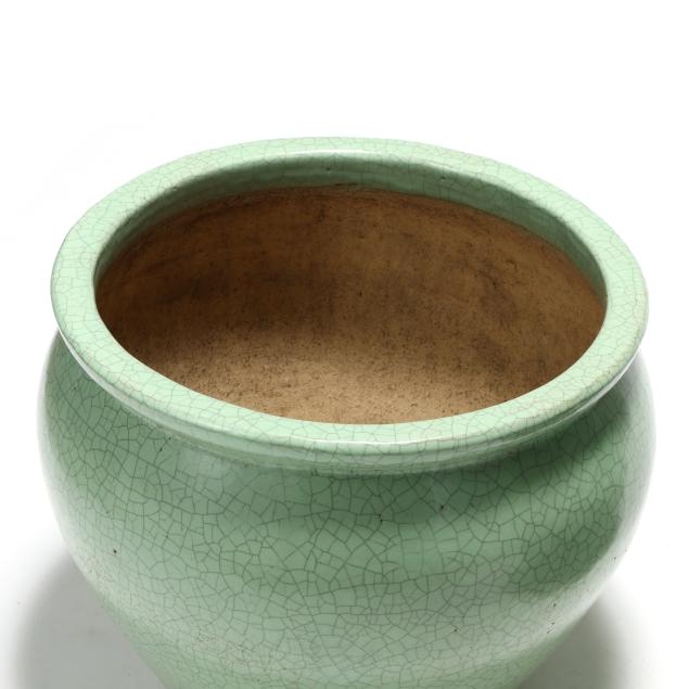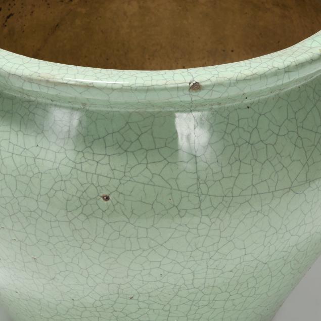 Late 20th century, fired ceramic, Asian style large fishbowl forms with attractive celadon green grackle glaze, unmarked.