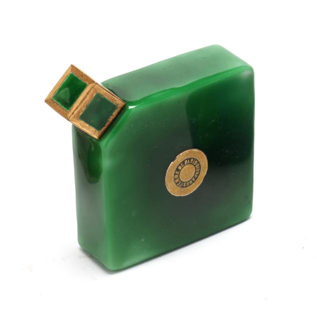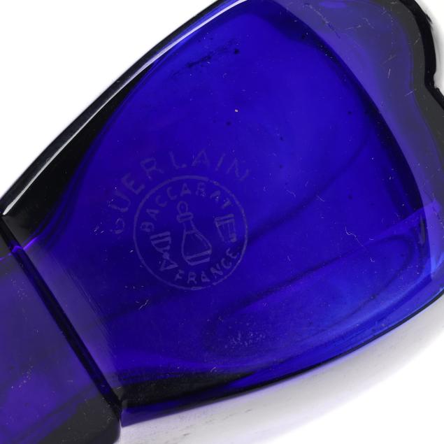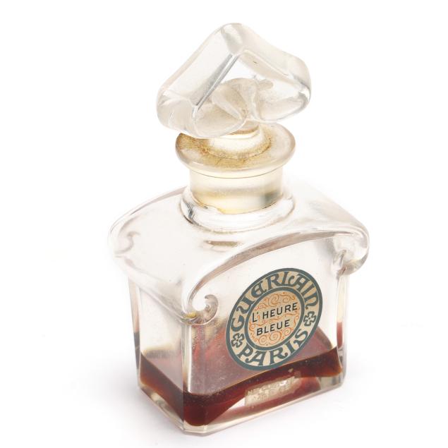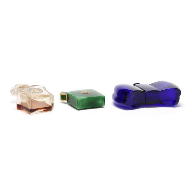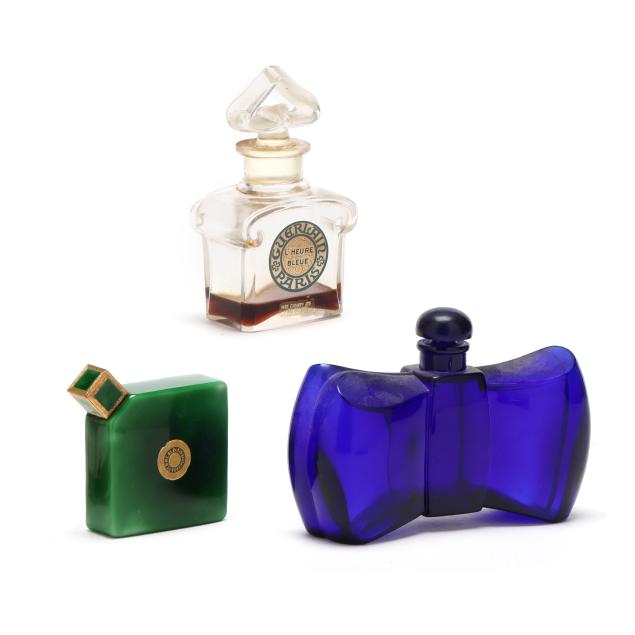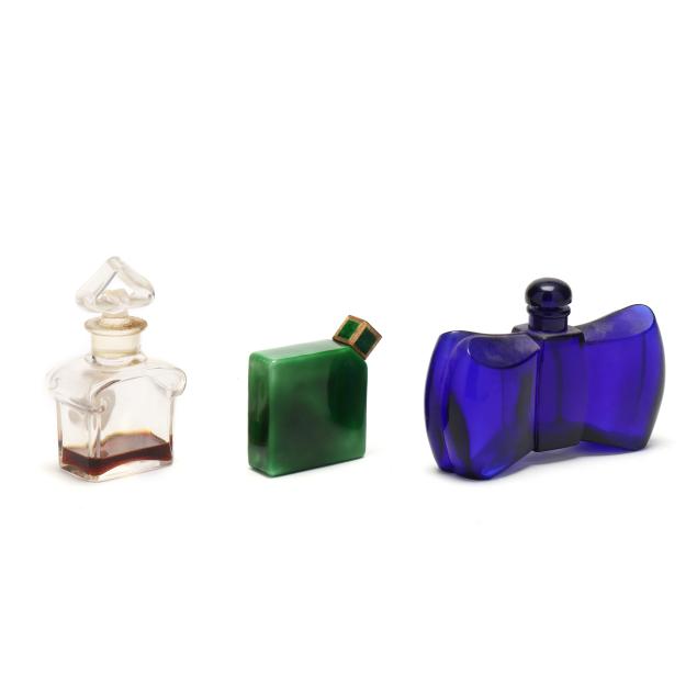 Early to mid-20th century, including a Ybry "Femme de Paris" green malachite glass bottle with gilt and enameled metal lid and interior glass stopper (3 x 3 x 1 in.); a cobalt blue bottle for Guerlain (4 x 6 x 2 in.); and a Guerlain "L'Heure Bleue" bottle (5 x 2.5 x 1.75 in.); all marked except the clear bottle.