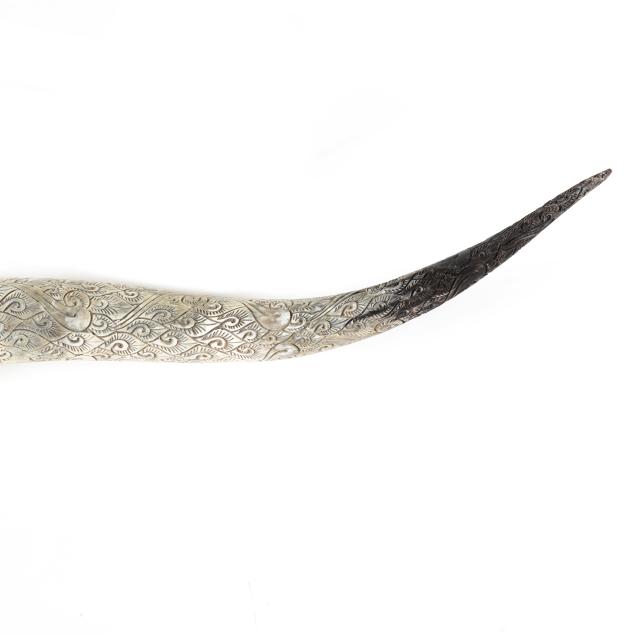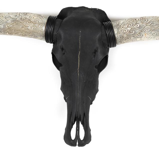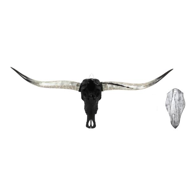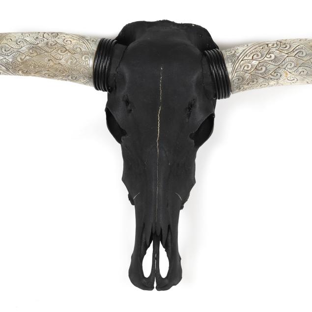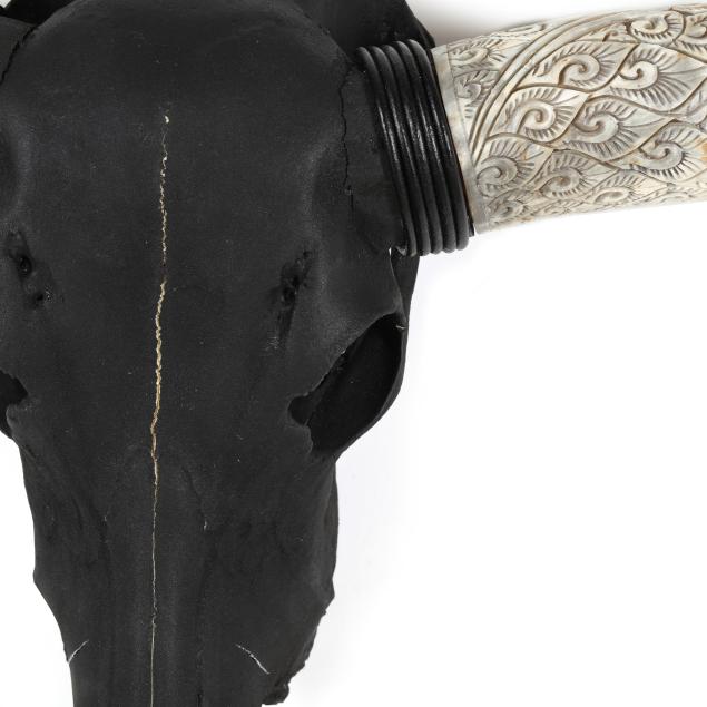 20th century, black-painted natural skull and reeded horn mounts, the horns carved with stylized foliate and scrolled patterns and painted at the distal ends, together with a custom ebonized wood oak wall mount.