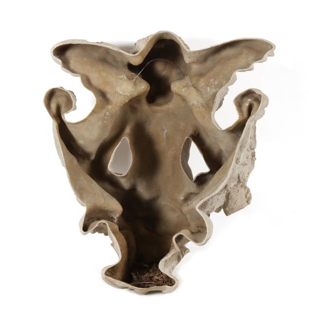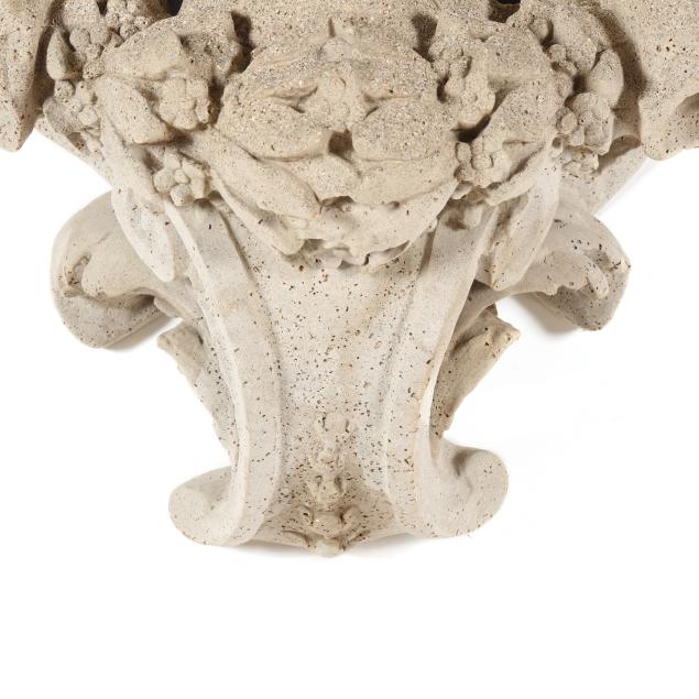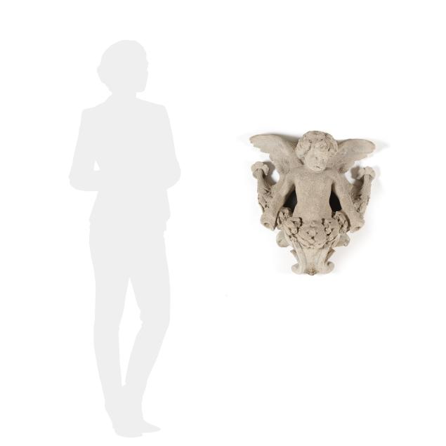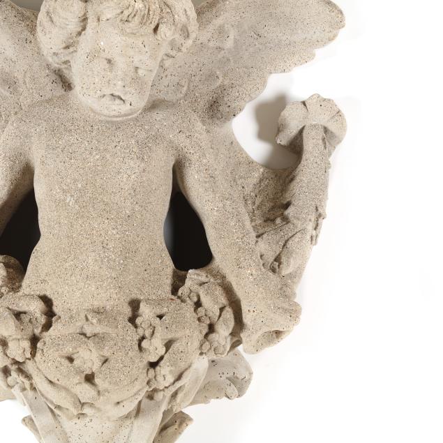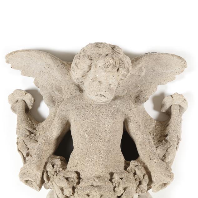 Late 20th century, fiberglass with textured faux stone surface, appears unmarked, molded in the form of a winged putto with laurel garland.