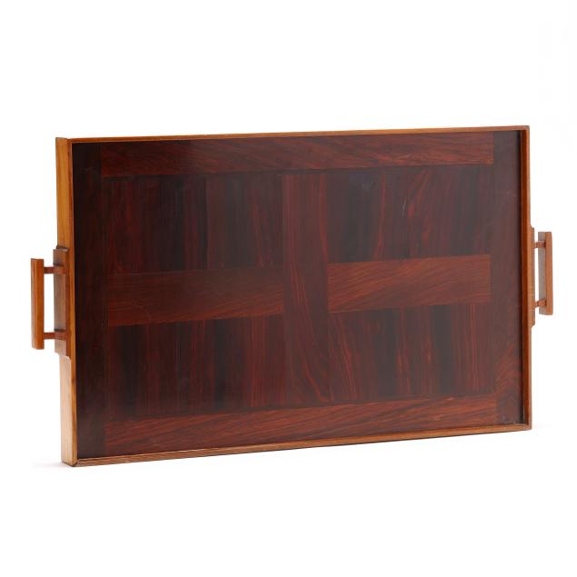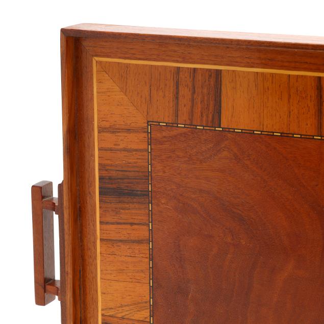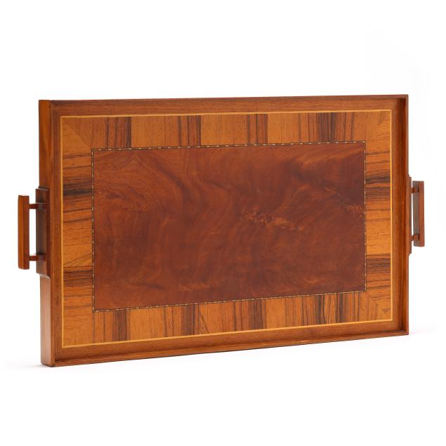 Contemporary, flame mahogany center with mixed wood inlaid border and double handles, not signed.