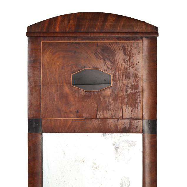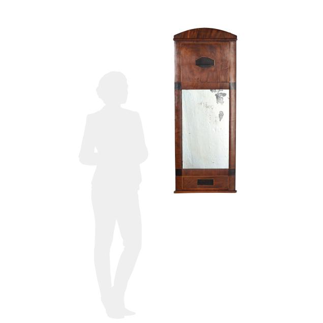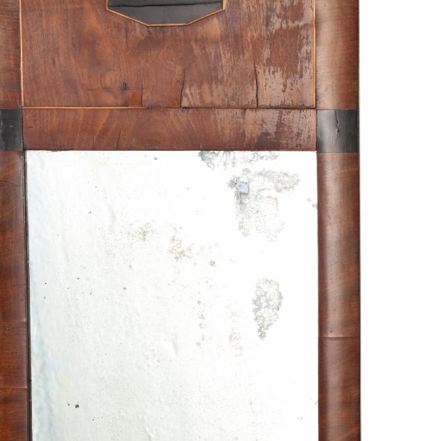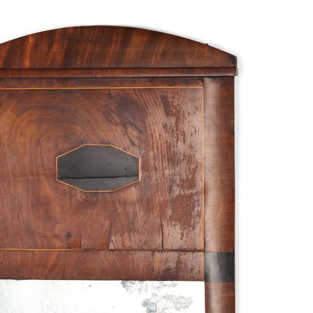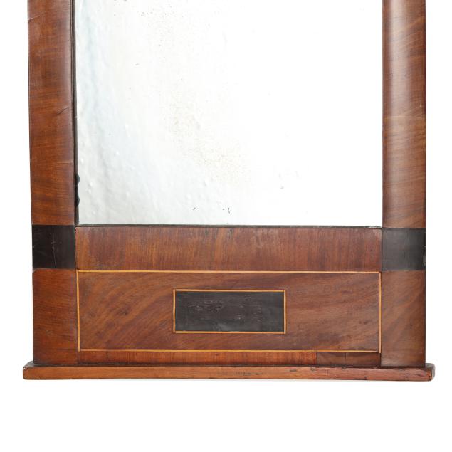 Circa 1840, featuring a rectangular mirrored glass with mahogany surround, light and dark wood inlays, and an arched pediment, not signed or labeled.