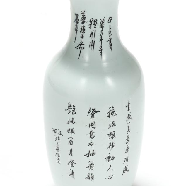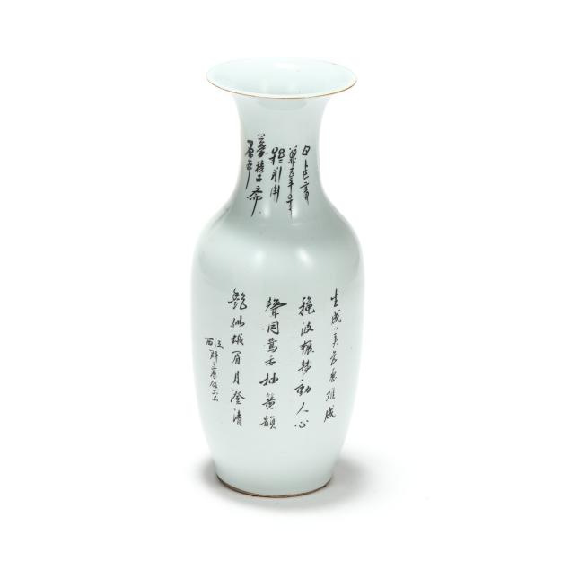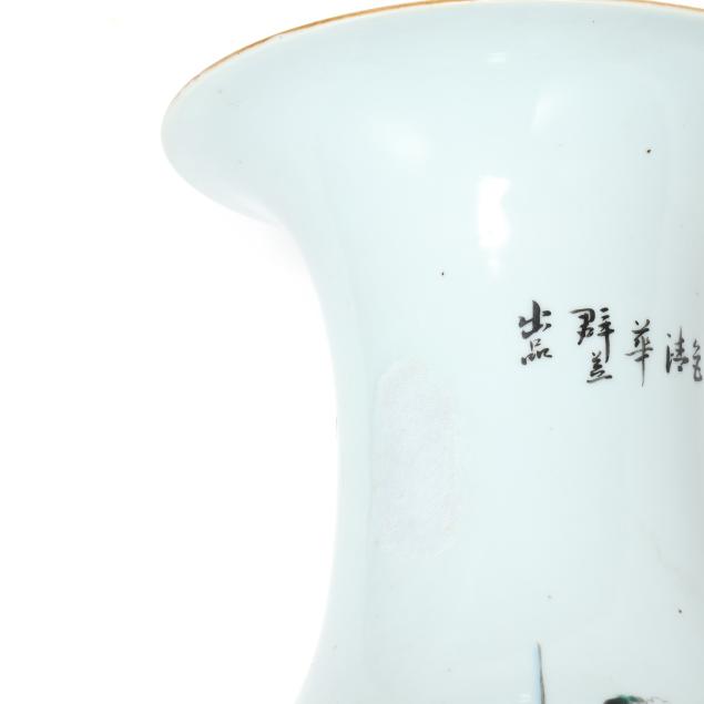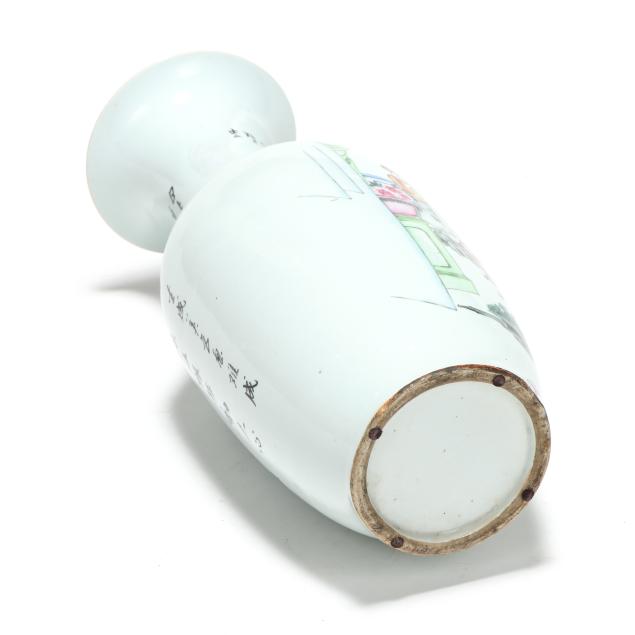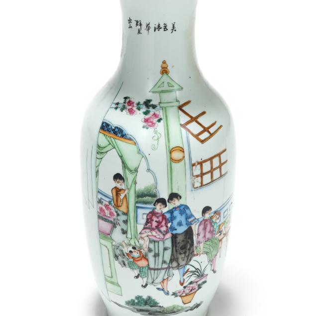 Early to mid 20th century, tall porcelain vase with flared mouth rim, hand painted in polychrome enamels with elegant ladies in modern style on a courtyard terrace, above them is an inscription, to the reverse side of the vase are more inscriptions.