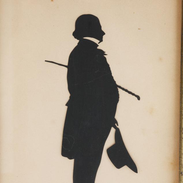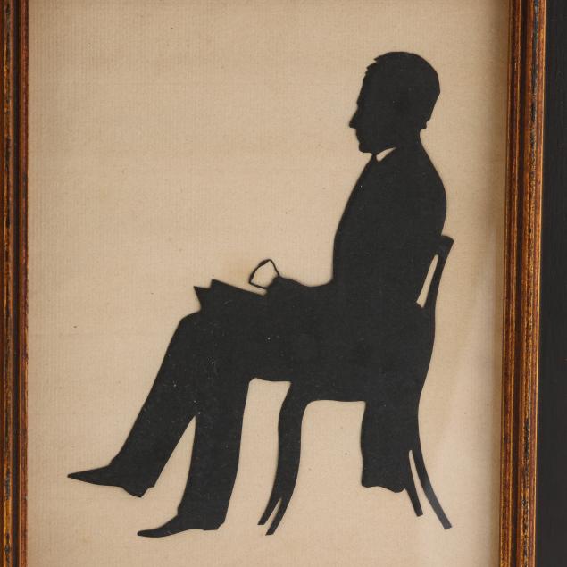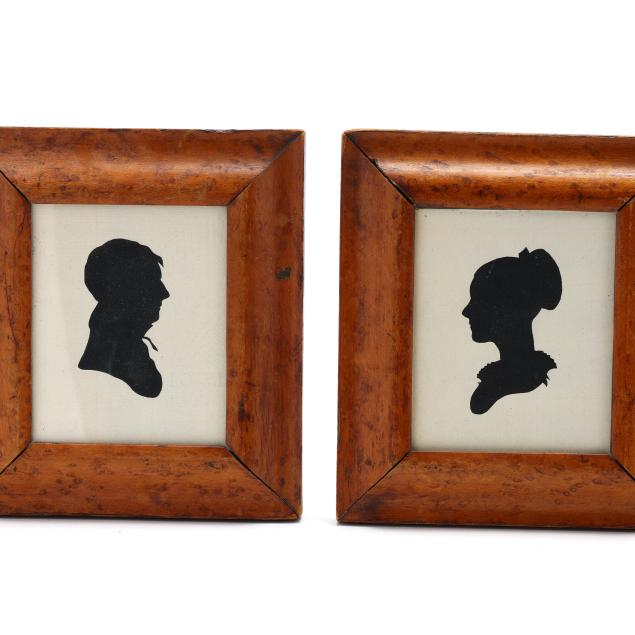 Late 18th-19th century, each cut and mounted onto laid paper, including a man and woman bust length profiles, mounted onto Dutch laid paper with Propatria watermark, presented in burl wood frames (7 x 6 1/4 in.); the third depicting a standing gent holding a hat, mounted onto Dutch laid paper with Propatria watermark, mounted within a later but antique gilt and ebonized frame (12 3/4 x 9 1/2 in.); the fourth of a seated gentleman holding spectacles, mounted within a later frame (10 x 7 3/4 in.).