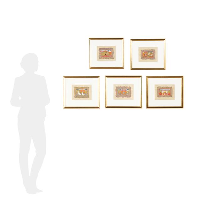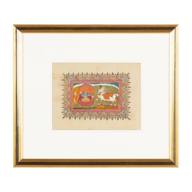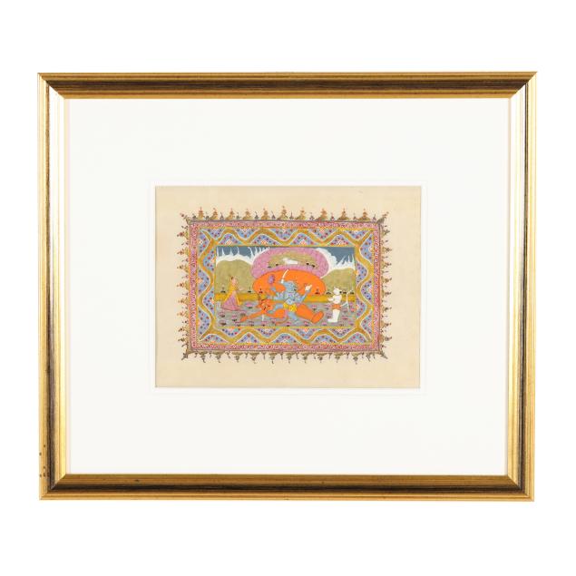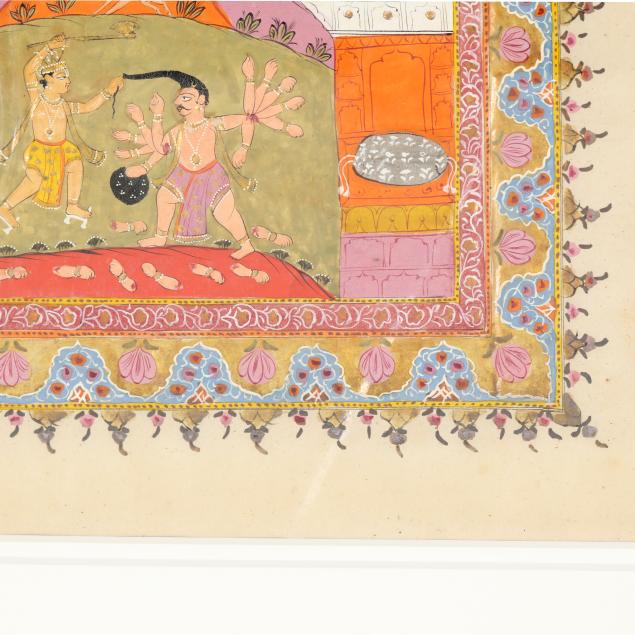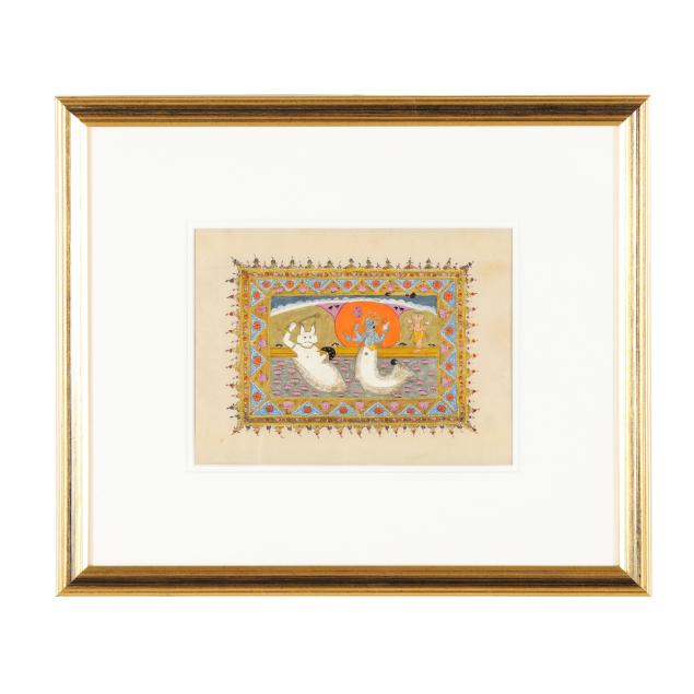 Mahabharata: three of the Hindu god Vishnu in his Avatar incarnations of Matsya (fish), Varaha (boar), and Nismbla (lion), one of Vishnu with Hsamkarna, and a painting of Pashuram fighting the demon Banashur, each professionally framed in an identical manner under glass with double mats in giltwood frames.