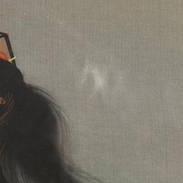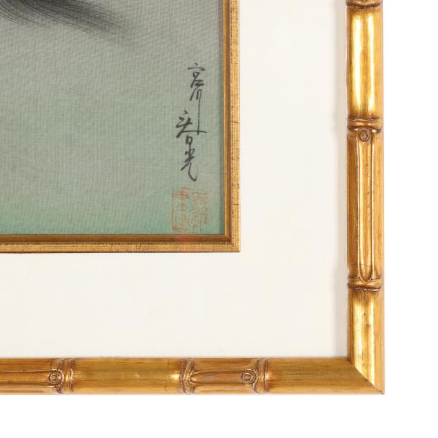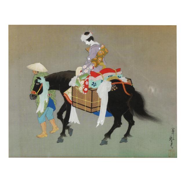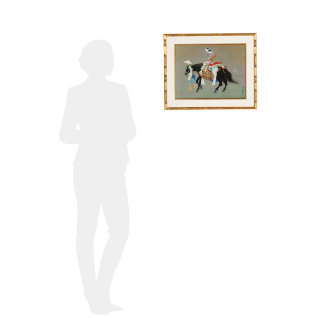 Early to mid 20th century, ink and colors on silk, painting of a beautiful Japanese woman dressed in fine kimono riding a horse being led by an attendant, signed to lower right corner together with red artist's seal, presented under glass with gold lined mat in a giltwood faux bamboo frame.