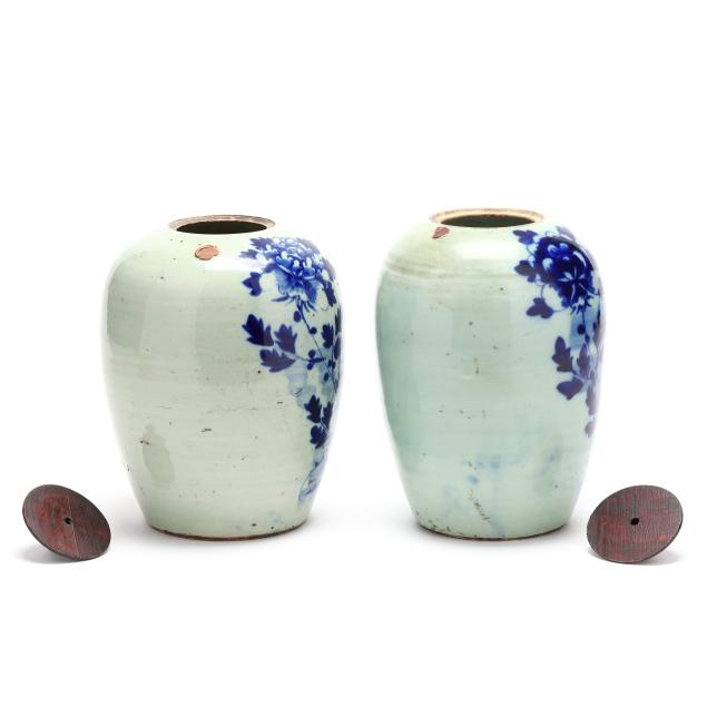 Late 19th century, porcelain decorated in blue with large floral blooms on a slightly celadon green body, brown wax export seals to body, topped with later wood lids.