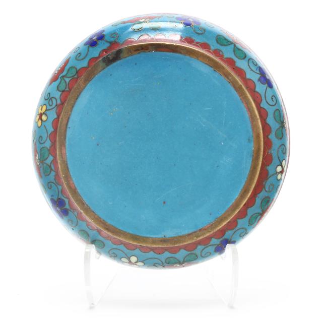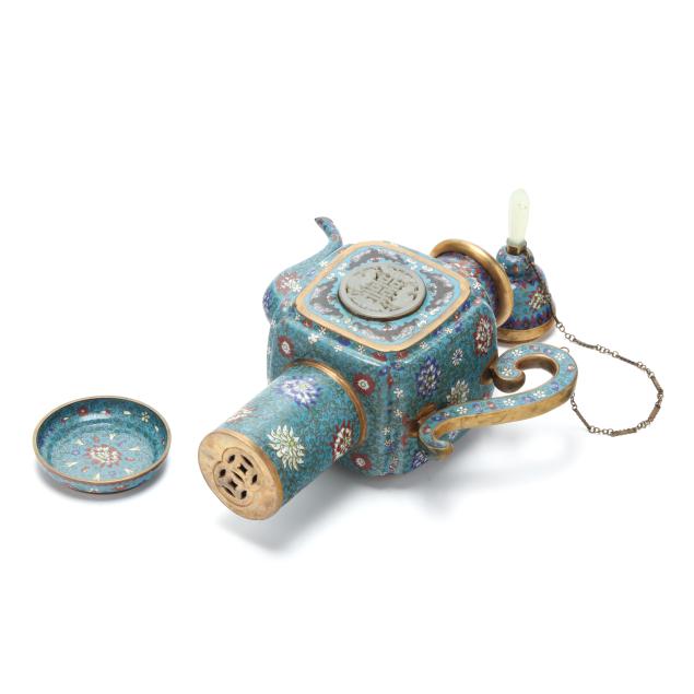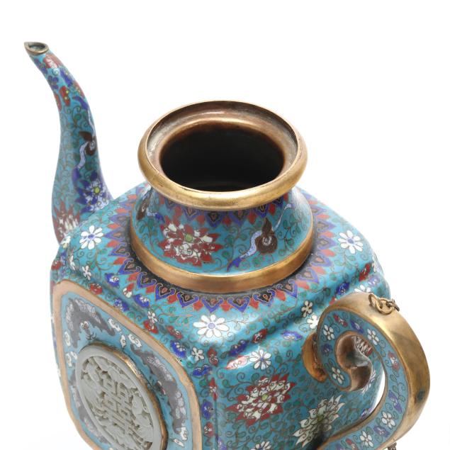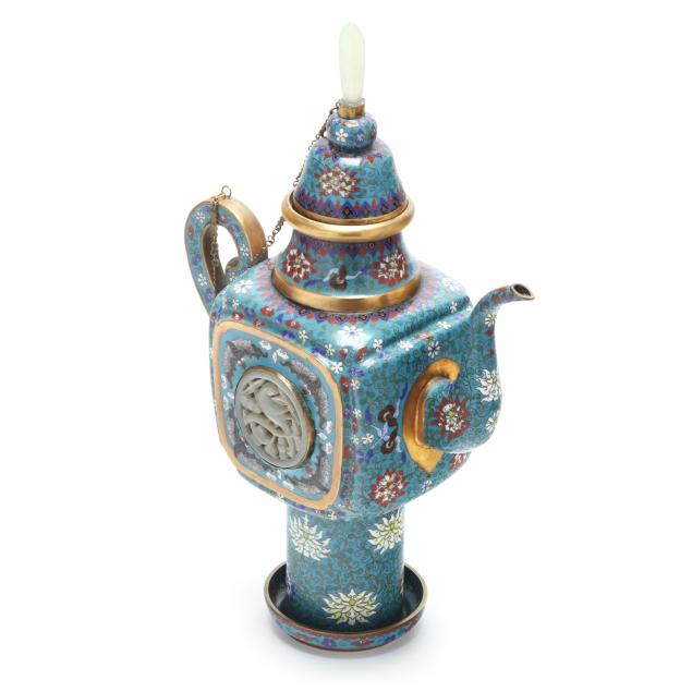 Qing dynasty (1644-1912), late 19th century, a cloisonne enamel covered ewer decorated with lotus scrolls on a turquoise ground, the square shaped central body is inset with carved white jade circular plaques, one centered with a double happiness character flanked by phoenix and bats, the other carved with a bird perched on a flowering branch, the ewer has a curved spout and a tall cylindrical foot with a reticulated double-coin motif to the underside, the flared neck is surmounted by a high domed cover with a jade finial, the cover is secured with a metal chain to the handle, presented resting on a matching cloisonne base.