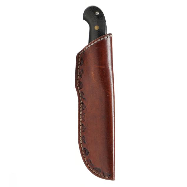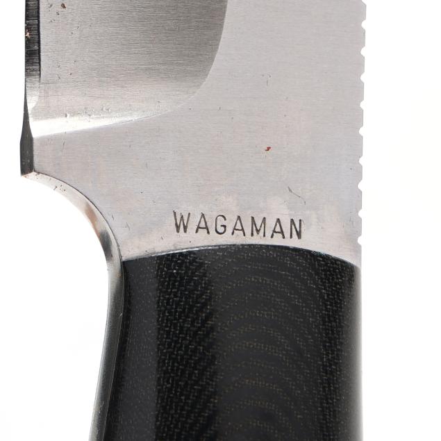 Fayetteville, North Carolina, Micarta handle, 5 in. stainless steel blade marked WAGAMAN, with tooled leather sheath.