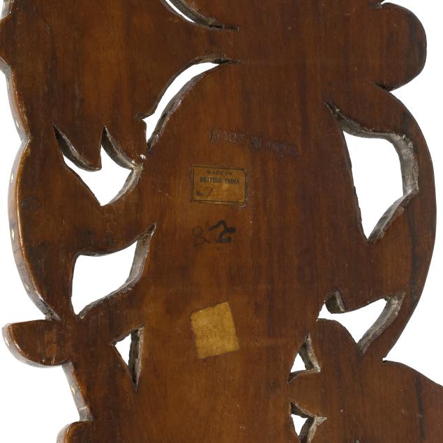 Late 19th century, teak folding chair with intricate bone and ebony inlaid decoration, having a pierced back in the form of opposing peacocks, leopard head arm terminals, with seat that can be removed and chair folded for for carrying, paper label to underside "Made in British India, No. 7" and incised "Made in India" to the seat.