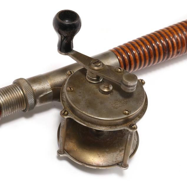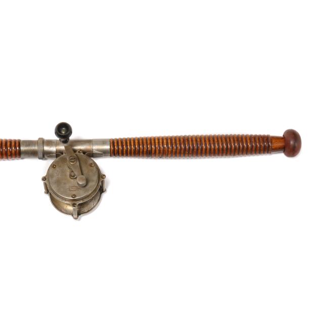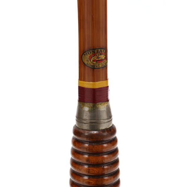 Montague Two piece bamboo boat rod measures 67 in. with a nickel plated pillar casting reel manufactured by Crown Fishing Tackle Works, Philadelphia, Pennsylvania.