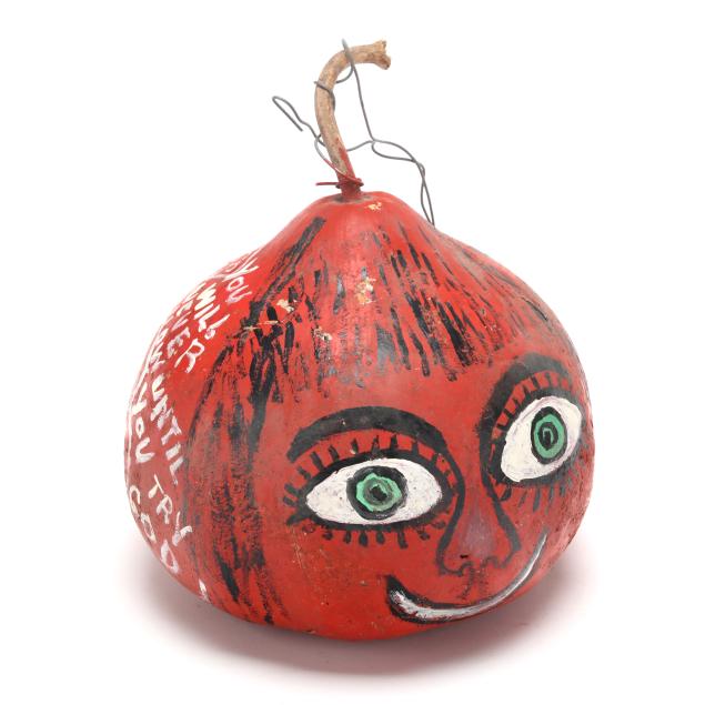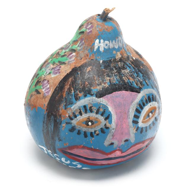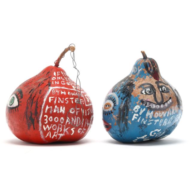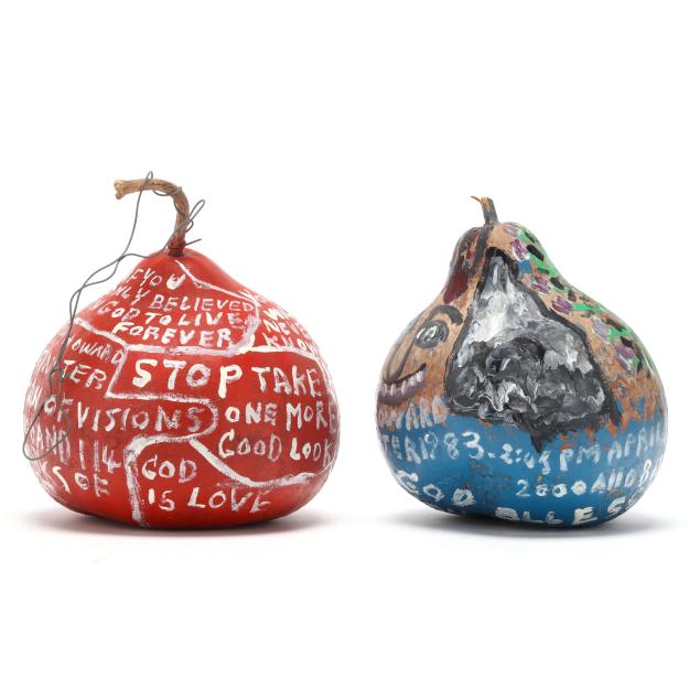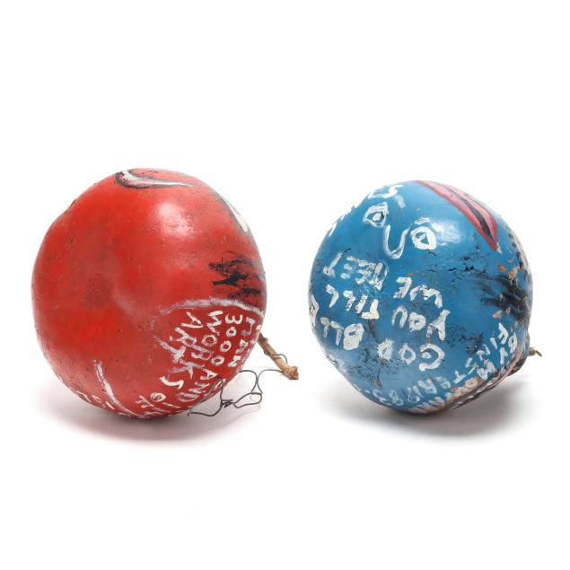 Late 20th century, the first with red ground, painted face to front and musings to posterior, includes wire to stem for hanging (8 1/2 x 8 x 8 in.); the second with blue ground, three painted faces, a budding plant, and musings to whole, dated 1983 (8 1/4 x 6 1/2 x 7 in.), both signed.