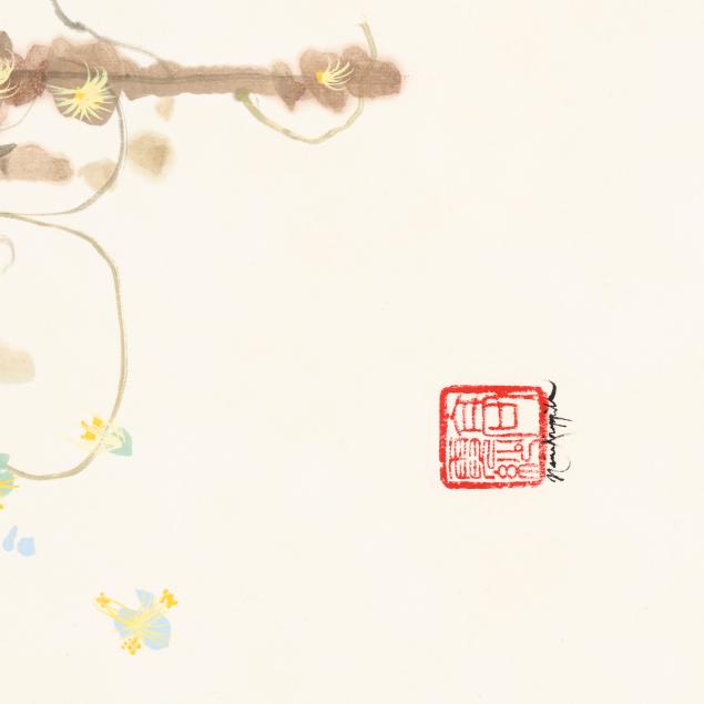 Watercolor and ink on mounted Chinese Rice paper, signed at lower left, mounted and framed below glass.