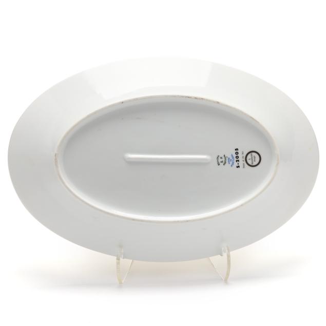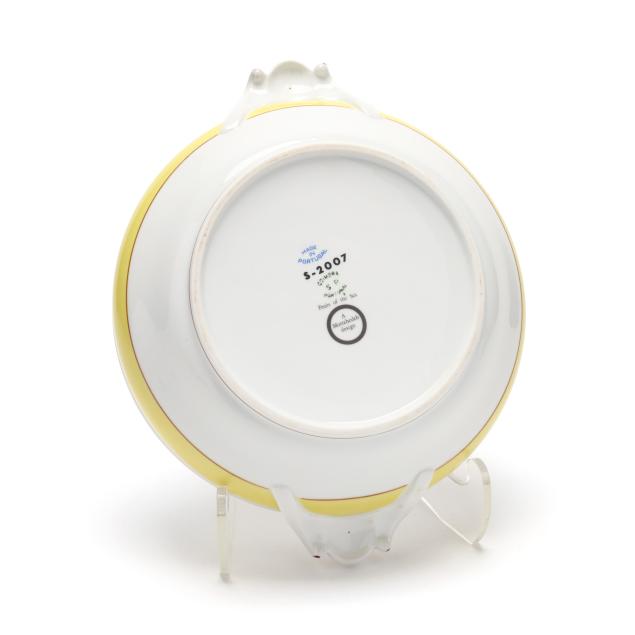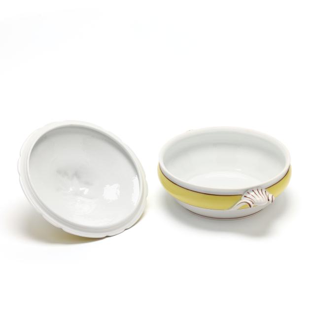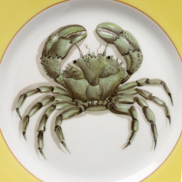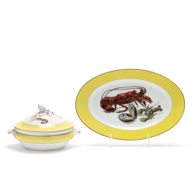 Made in Portugal, (26) pieces in discontinued pattern with hand-painted sea creatures, yellow banded rim, and brown trim, including (8) dinner plates (9 3/4 in. diameter); (8) rimmed soup bowls (1 1/2 x 8 3/4 in. diameter); (8) bread and butter plates (6 3/8 in.); an oval serving platter (10 1/8 x 15 3/8 x 2 in.); and a covered vegetable tureen (6 3/4 x 10 1/2 x 8 1/2 in.), all marked to underside.