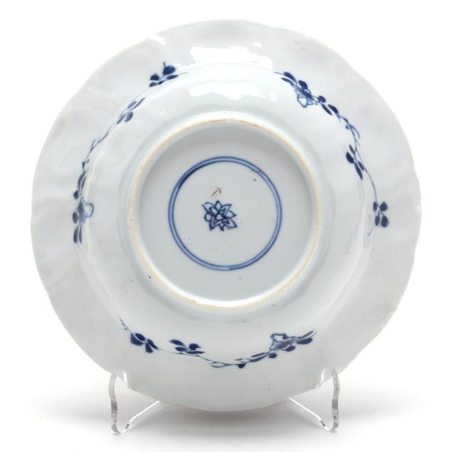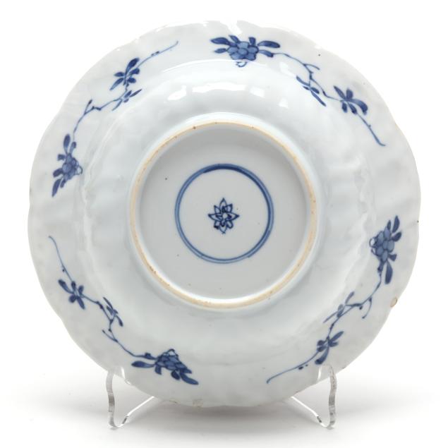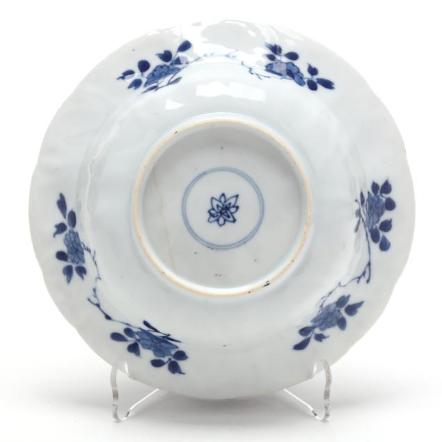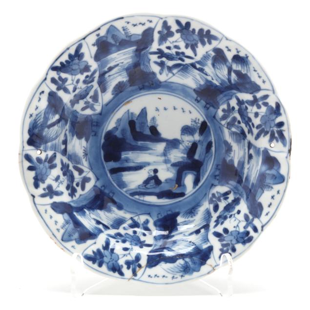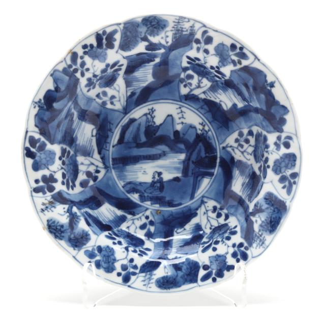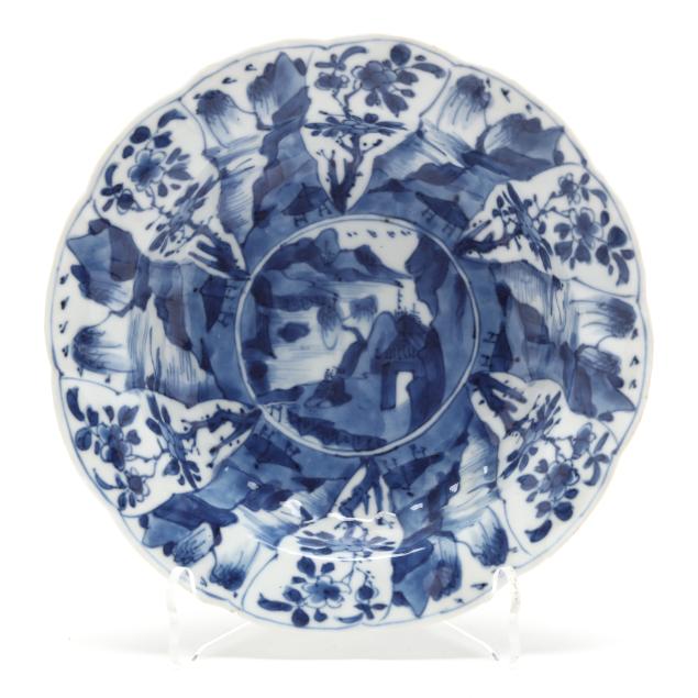 Kangxi period (1662-1722), porcelain hand-painted in underglaze blue, each bowl with a picturesque riverside landscape to the center well surrounded by shaped petal reserves alternating between riverside landscape scenes and flowers, the exterior sides painted loosely with a plum branch, underside of each with flower mark within two blue circles.