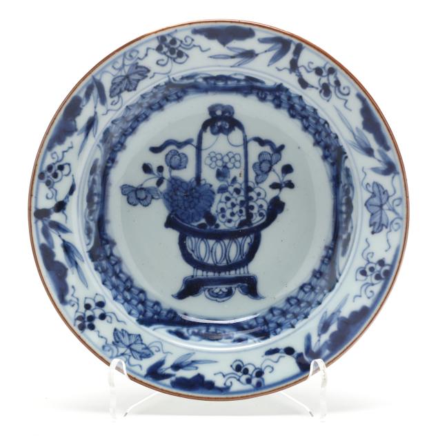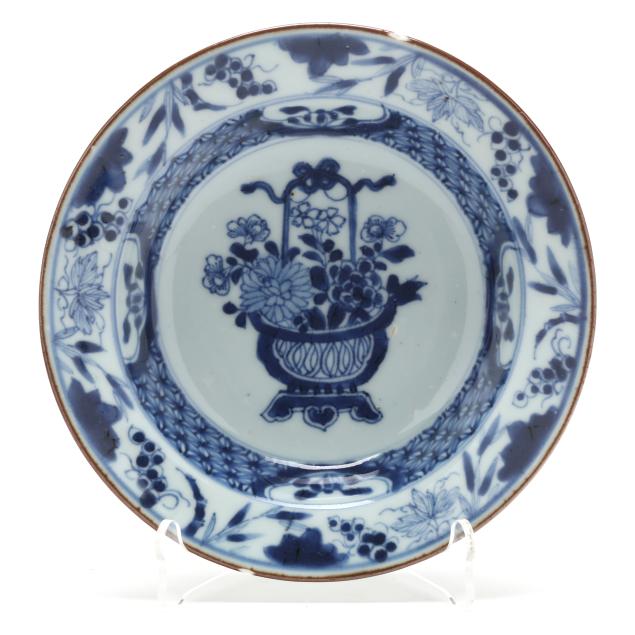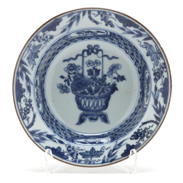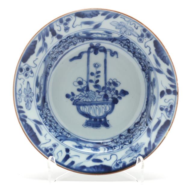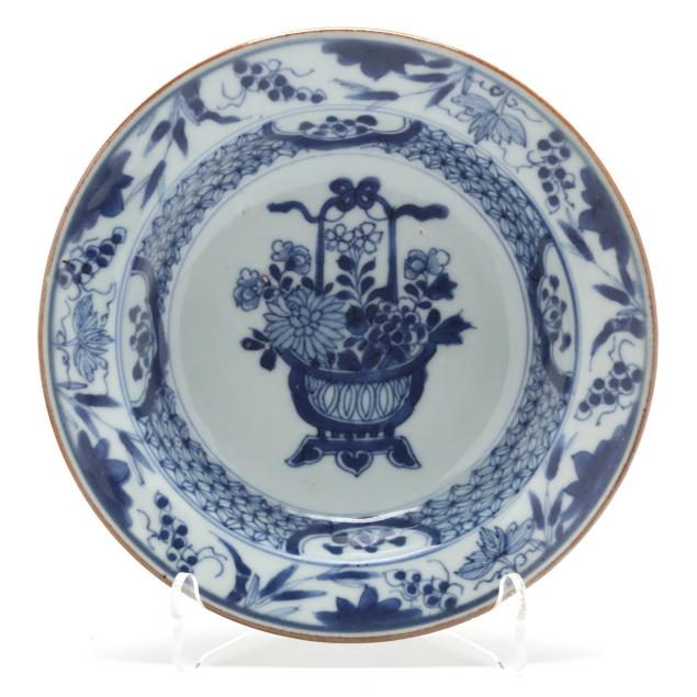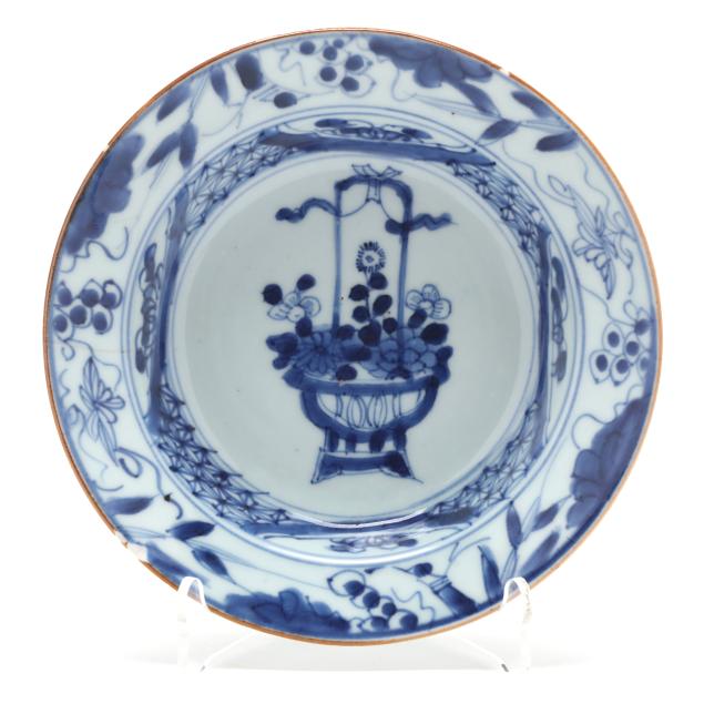 Kangxi period (1662-1722), porcelain hand-painted in underglaze blue, each bowl with basket full of lush blooming flowers to the center well surrounded by a loosely painted border of grapevines, the exterior sides with abstract plum branch, unmarked.