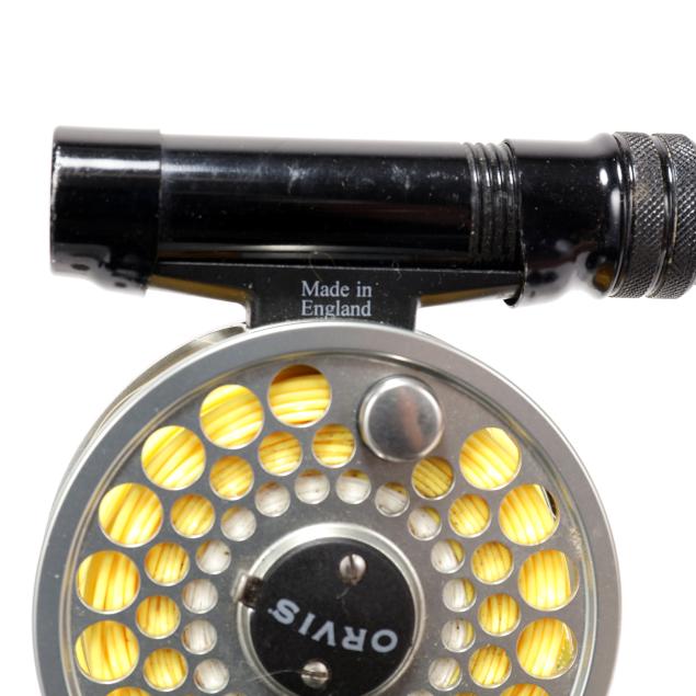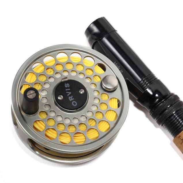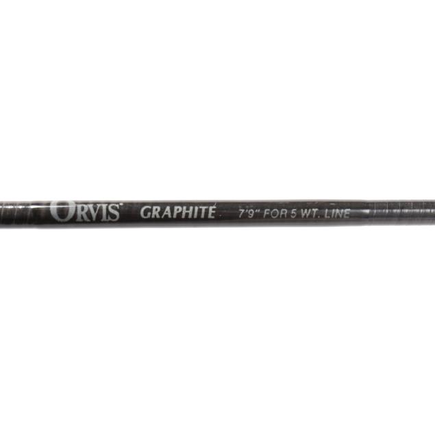 An Orvis rolled graphite 7'9", 5 weight 2/1 Fly Rod with an Orvis Battenkill BBS III Fly reel with line. The other is an Orvis Impregnated Battenkill 2/2 bamboo fly rod, each section measuring 51.5 in.