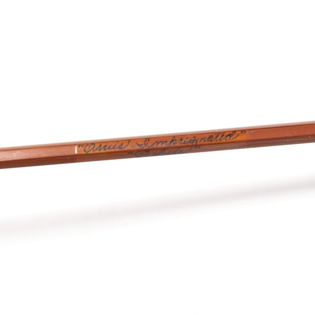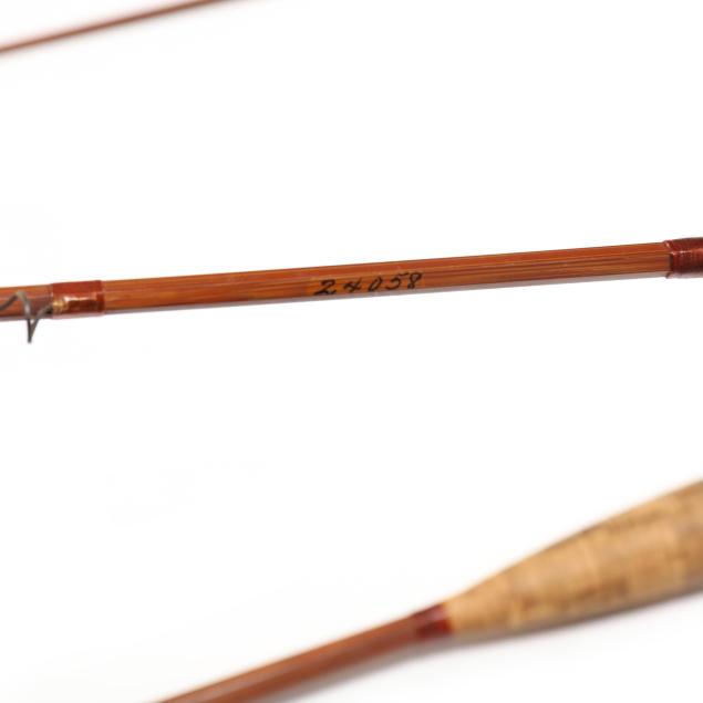 Serial number 24058 present on caramel colored flamed bamboo, silk wraps, cork grip with reel slides over a cork reel seat, in factory aluminum tube, the sock is not present.
