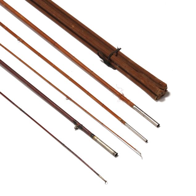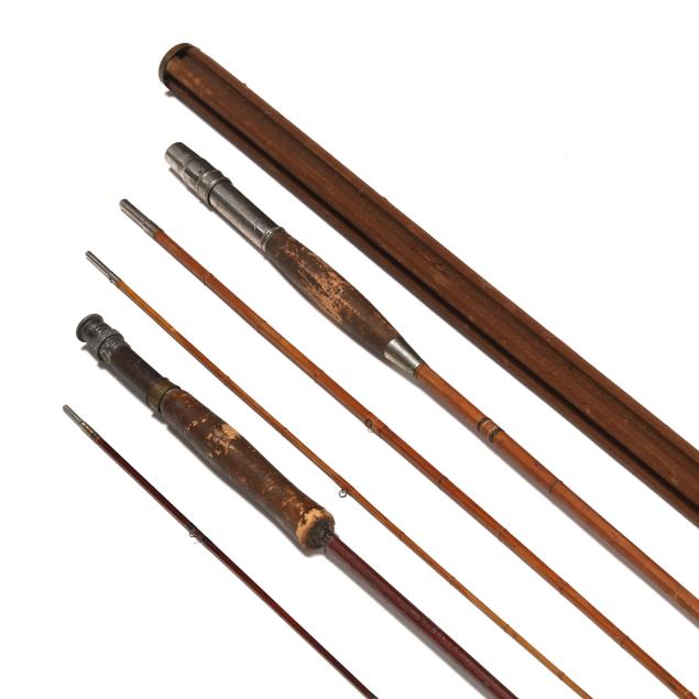 From the Collection of a Lady, Charlottesville, Virginia Surface and staining wear throughout; the darker lacquered rod missing the central rod section; case missing terminal mounts, tears to canvas; without reel and line.