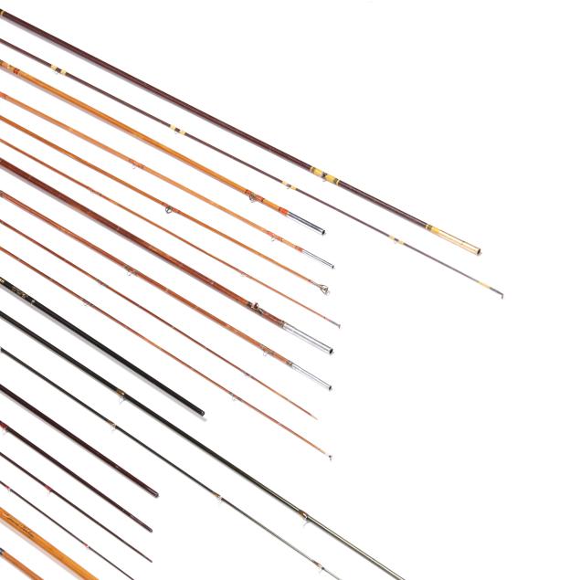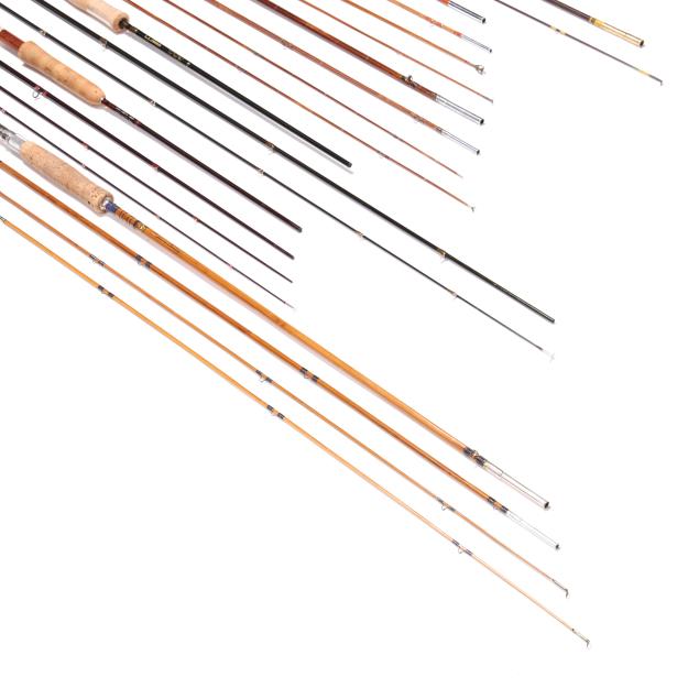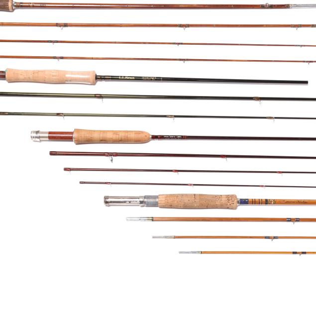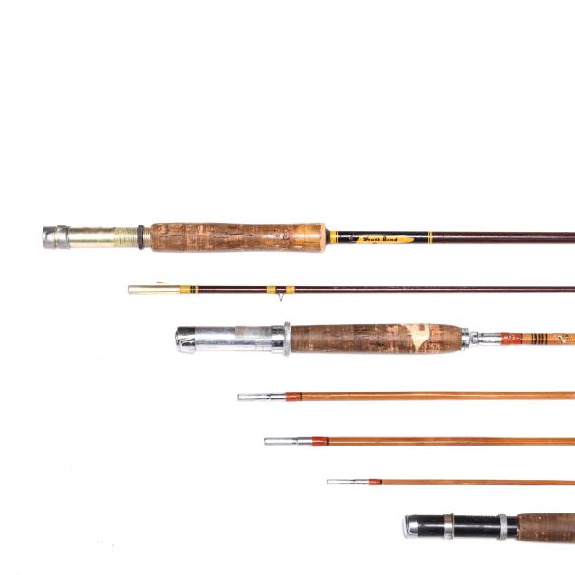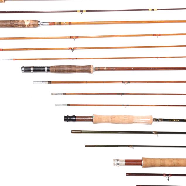 Second half 20th century, rods include (2) Montague Rapidan rods with (3) rod sections; Montague Rapidan rod in (4) rod sections; one marked South Bend with rod two sections; one by L.L. Bean in three sections; and a Spring Branch Creek rod in (4) sections. All without reels and line.