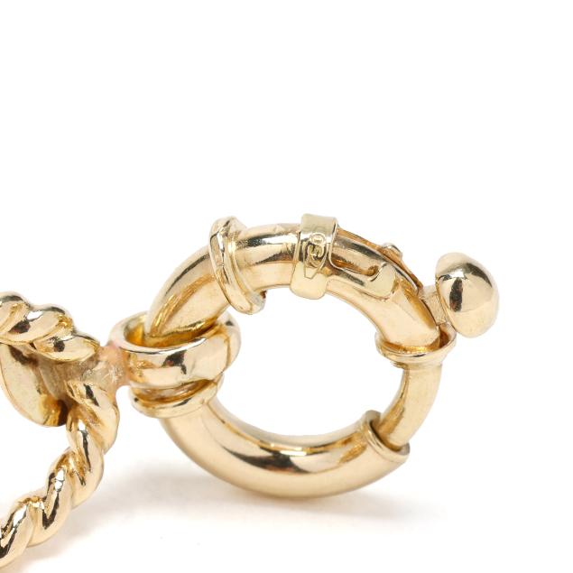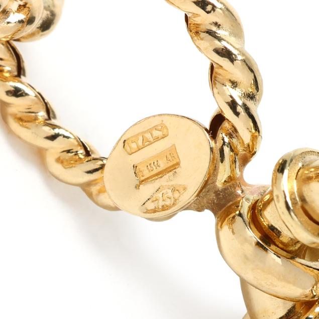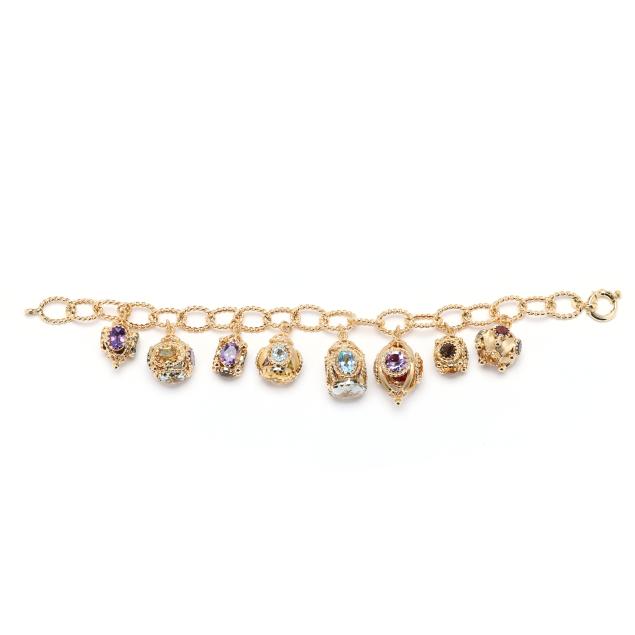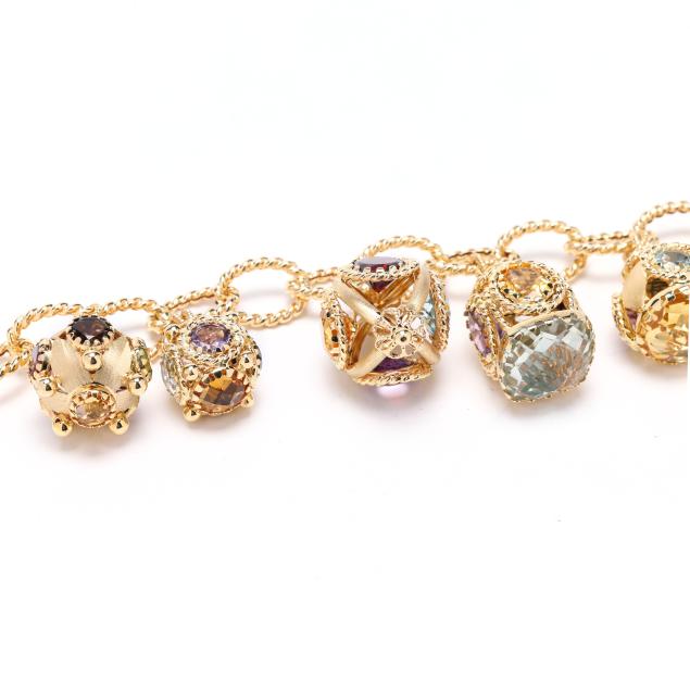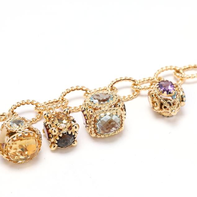 The gold rope motif oval link bracelet suspending (8) ornament charms set with gemstones to include: amethyst, peridot, smoky quartz, garnet, citrine, blue topaz, and praseolite quartz, completed with a spring ring clasp, stamped Italy / 750 and with Italian registry 1314 AR for Idea D'Oro.