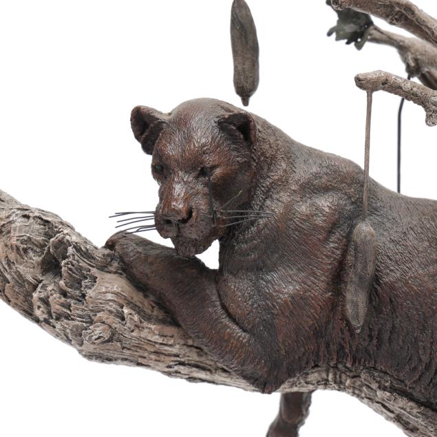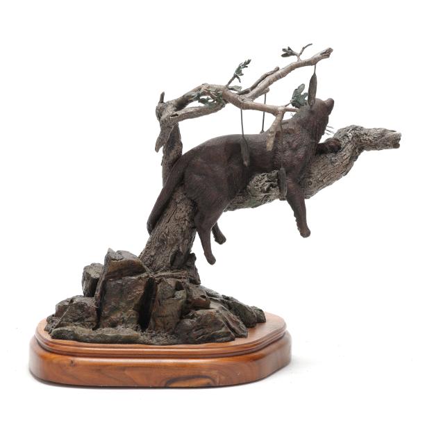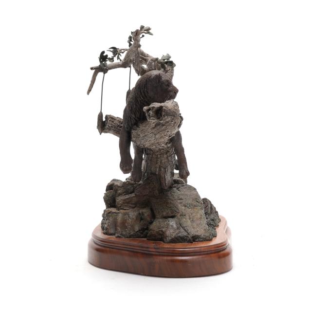Patinated bronze, signed and edition numbered "Gary R. Swanson 13/100" to the terrace edge, mounted on a conforming swivel walnut base.