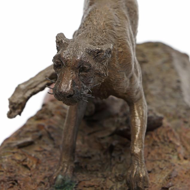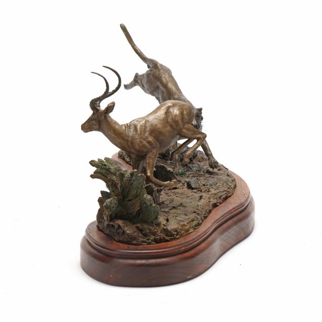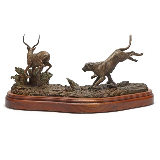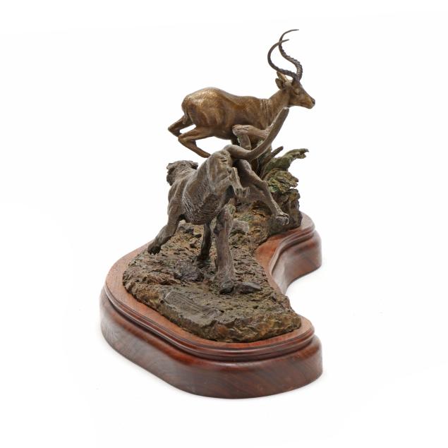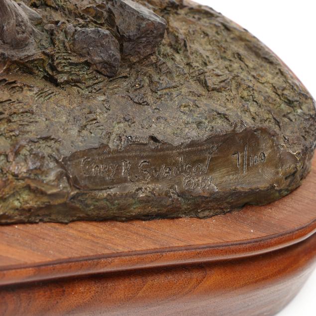 1987, patinated bronze, edition numbered "7/100," with signature and date "Gary R. Swanson / © 87" to the terrace edge, depicting a chase between an impala and predator, mounted on a conforming swivel walnut base.
