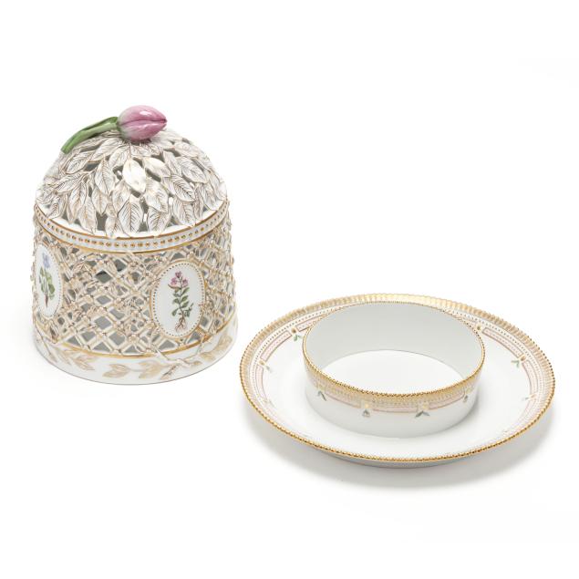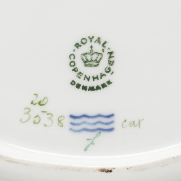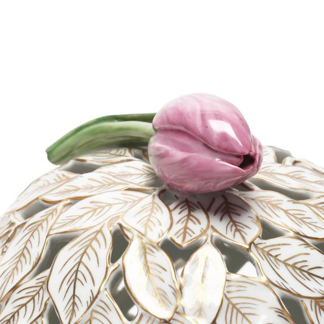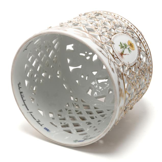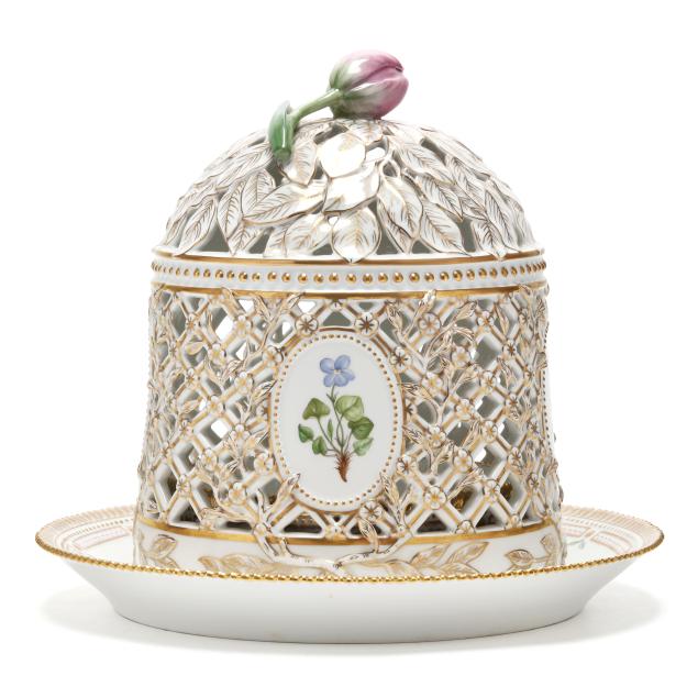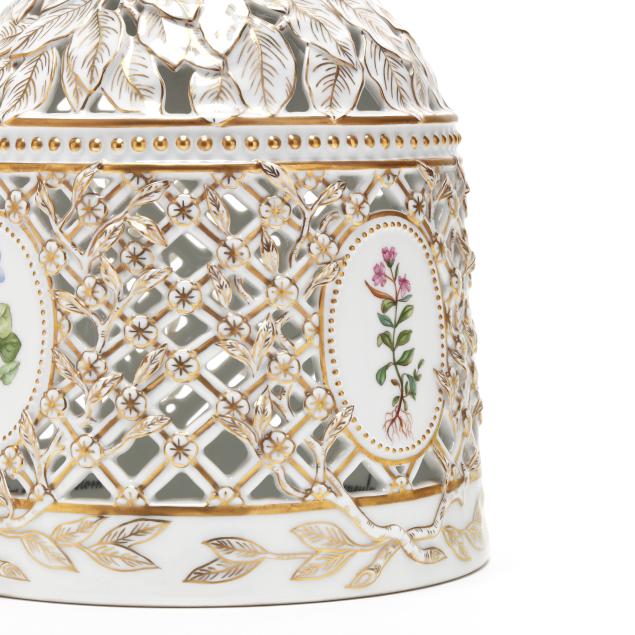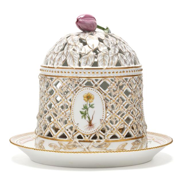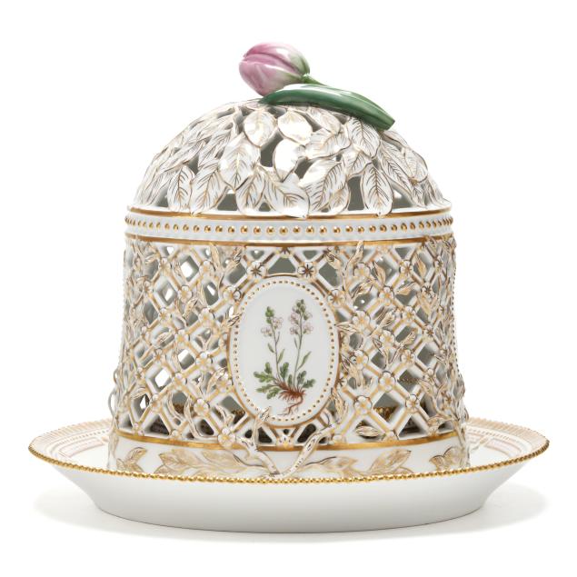 Denmark, 1969-1973, hand-painted and gilt porcelain, shape no. 3538, pattern no. 20, marked with green printed and blue wave factory marks with Latin botanical specimen name to the underside, the cloche form pierced cover with tulip finial and painted with four oval panels of herbaceous species