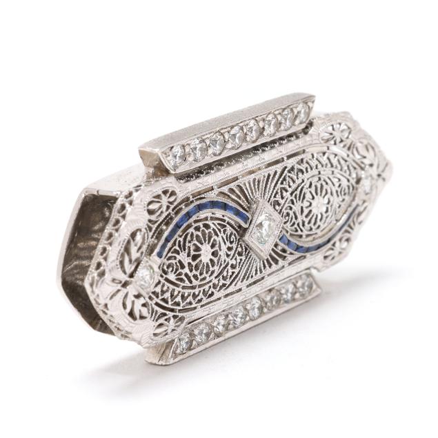 The white gold filigree slide pendant with finely engraved floral and foliate motifs, set with full cut round diamonds weighing approximately .85 total carat (I-J color, SI2-I1 clarity) and with French cut synthetic sapphires, testing 14KT.