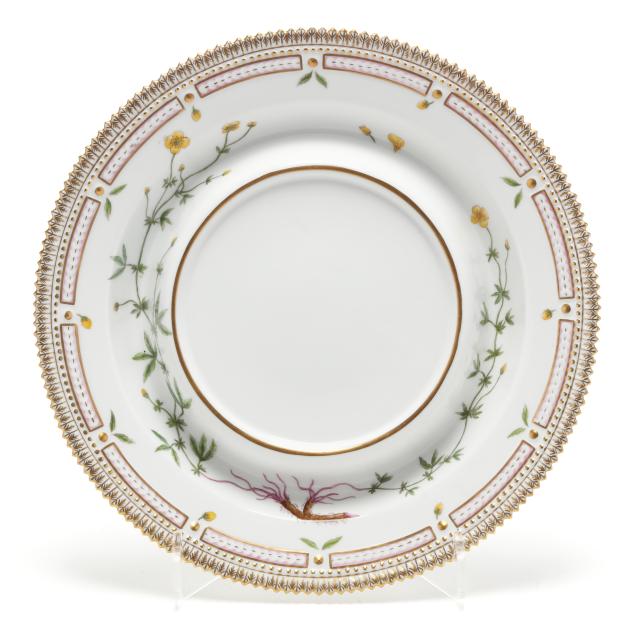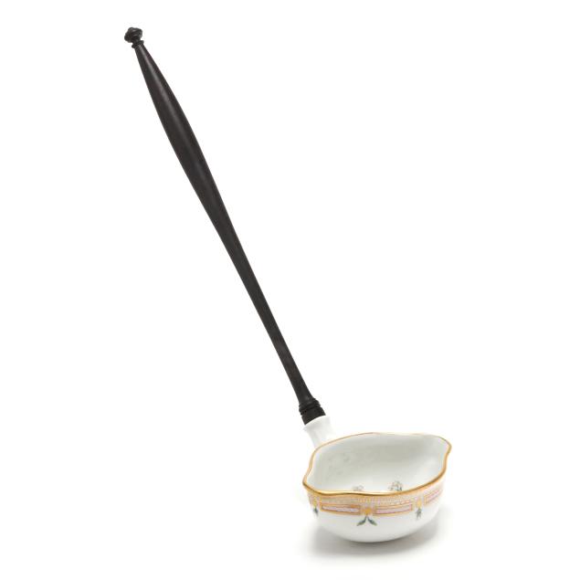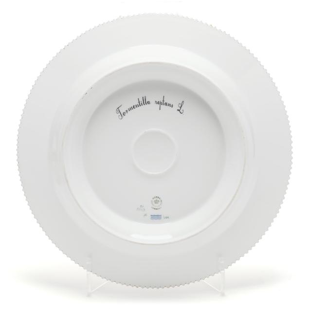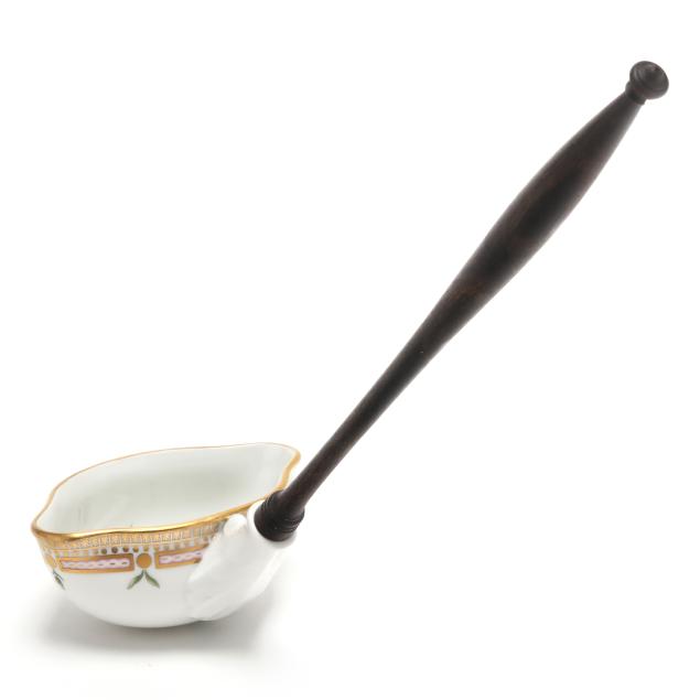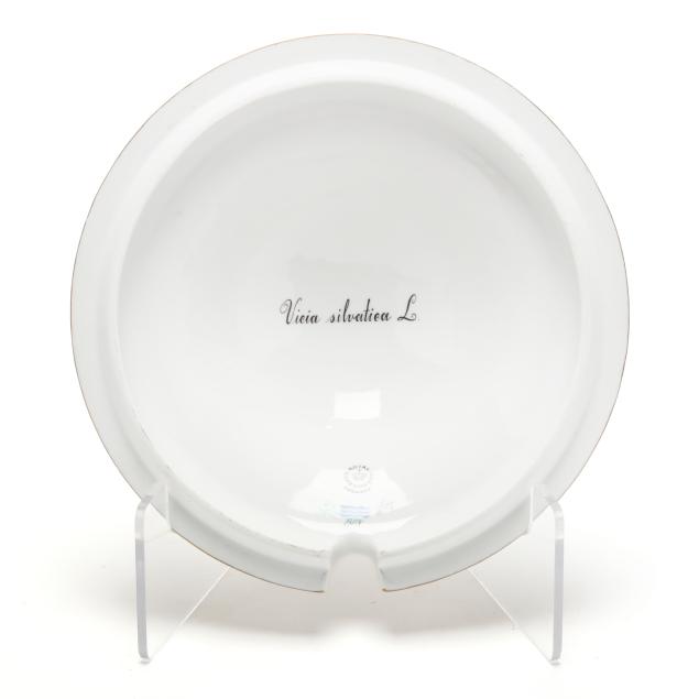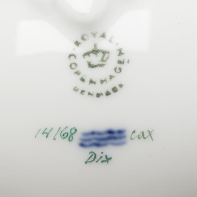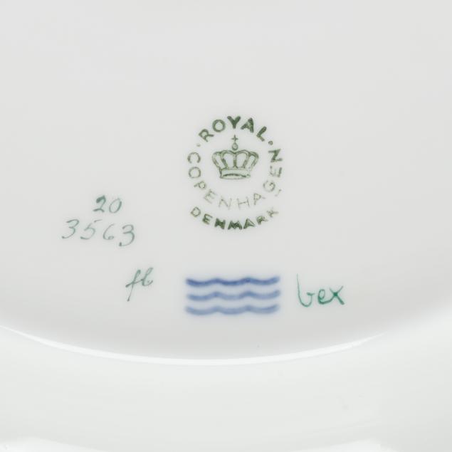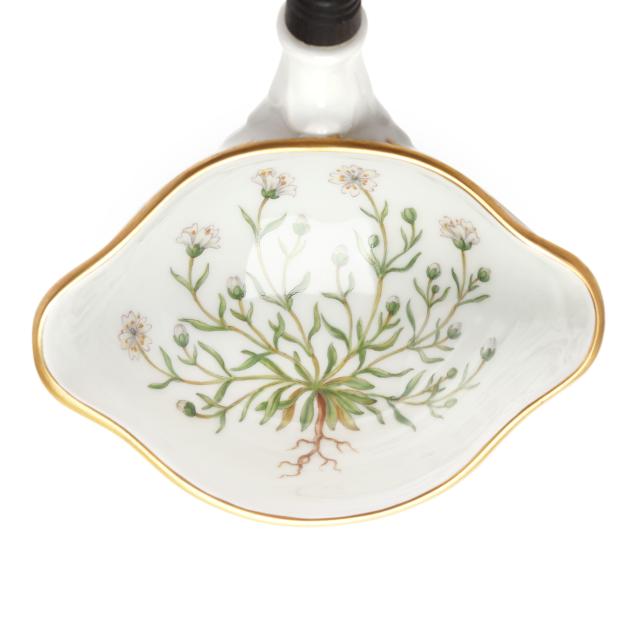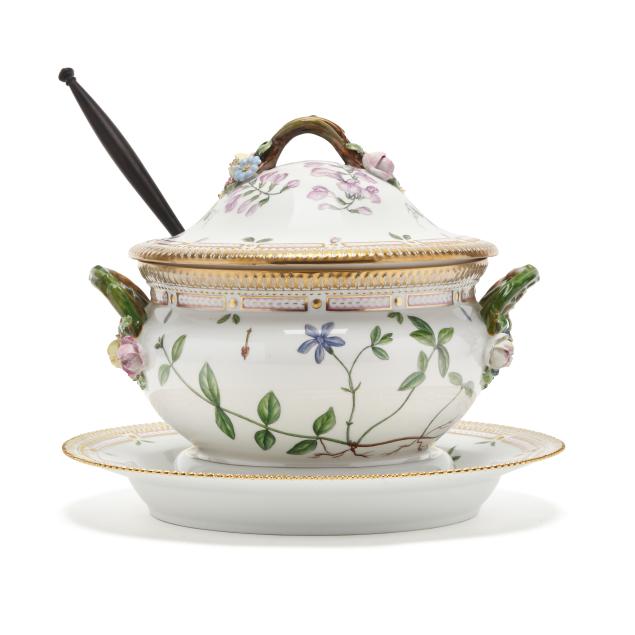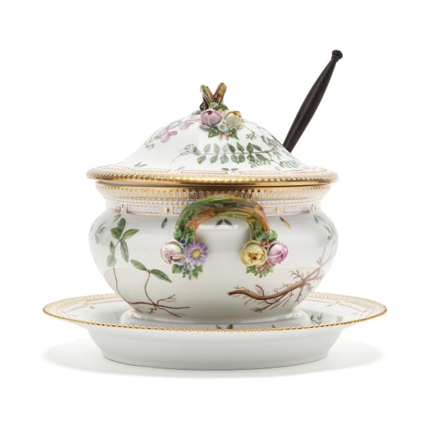 Denmark, hand-painted and gilt porcelain, pattern no. 20, marked with green printed and blue wave factory marks with Latin botanical specimen name to the underside, to include a 3 qt. round tureen with cover, shape no. 3562, 1969-1973, the bowl decorated in Vinca minor L. and Melilotus dentatus Pers. between flared neck and dual floral branch handles (5 1/2 x 12 x 9 3/4 in.), and cover decorated in Vicia silvatica L. (4 x 9 3/4 x 9 3/4 in.). Together with the conforming underplate shape no. 3563, with 1974-1978 date mark, decorated with Tormentilla reptans L. (1 3/4 x 13 1/4 x 13 1/4 in.); and wooden handled ladle, shape no. 14168, with 1974-1978 date mark (15 x 4 1/2 x 3 1/4 in.).