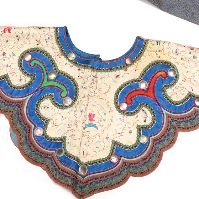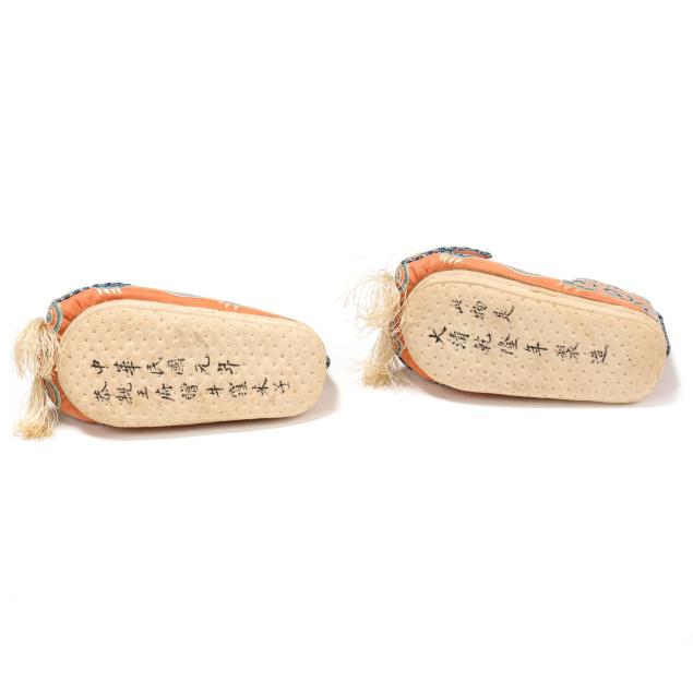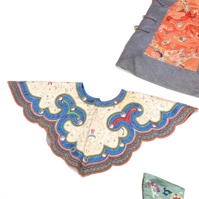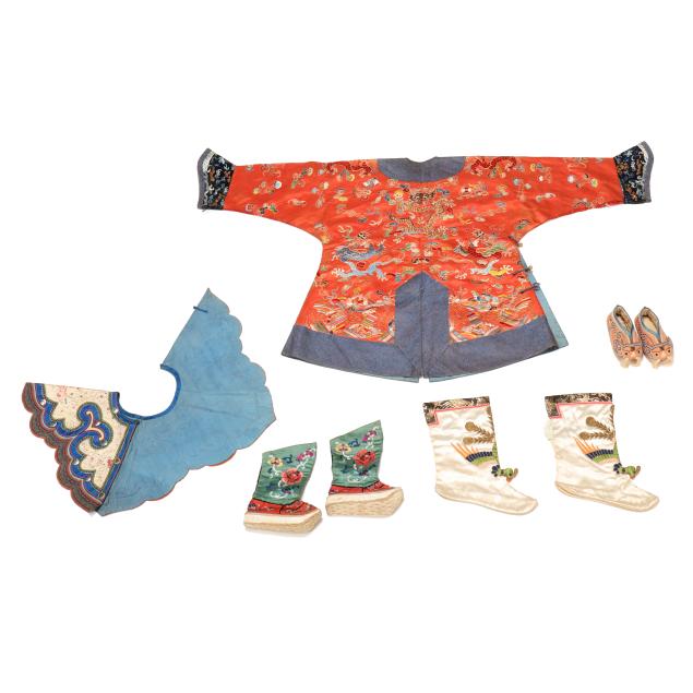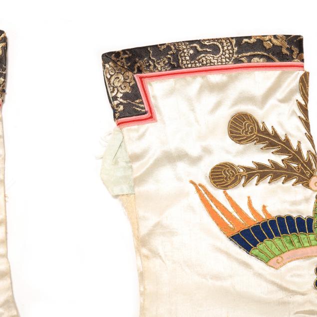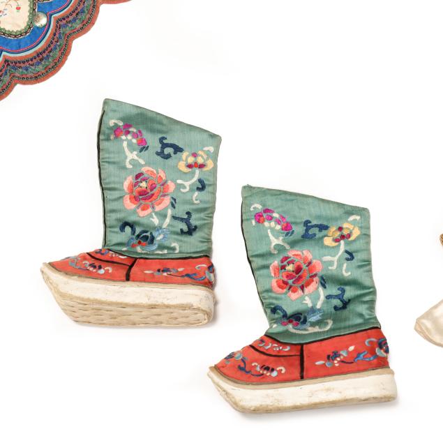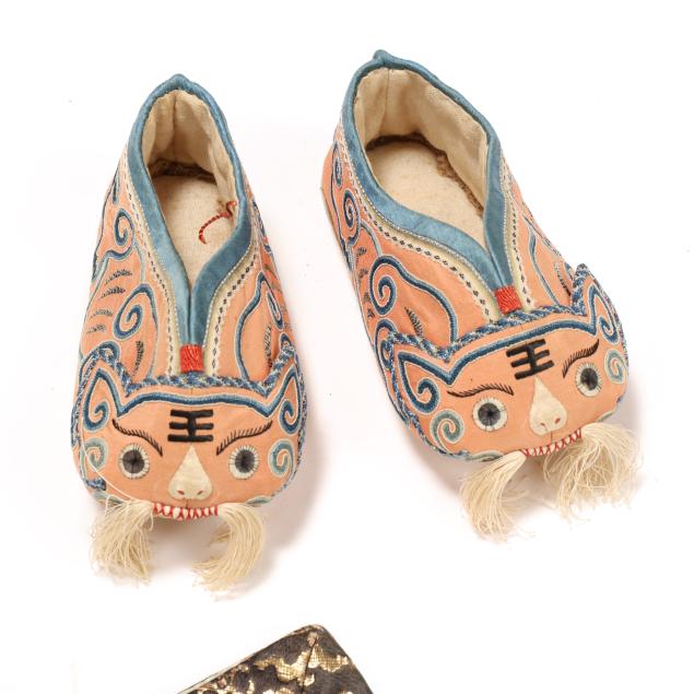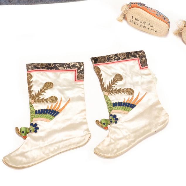ruyi wedding collar (25 x 26 in.)(good estate condition; some water stains), and three pairs of children's shoes: lion head slippers with inscription to soles (2 1/2 x 5 1/2 x 5 1/2 in.)(even fading to silk), embroidered silk boots with soles (9 x 5 x 6 1/2 in.)(good estate condition), and phoenix head boots without soles (12 x 9 in.)(one with separation to silk along back.)