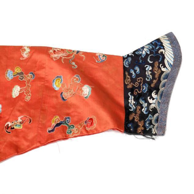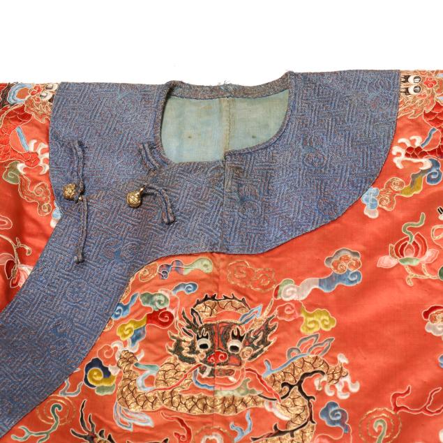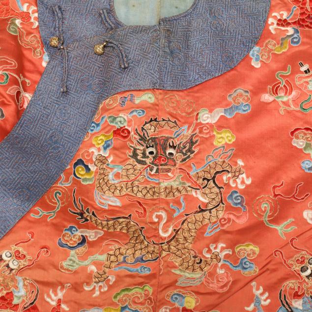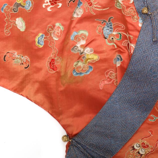 Qing dynasty (1644-1912), 19th century, includes an apricot ground silk dragon court jacket (Hanging 27 1/2 x 49 in.)(scattered stains; separation and tears to silk along edges; some soil to surface), a