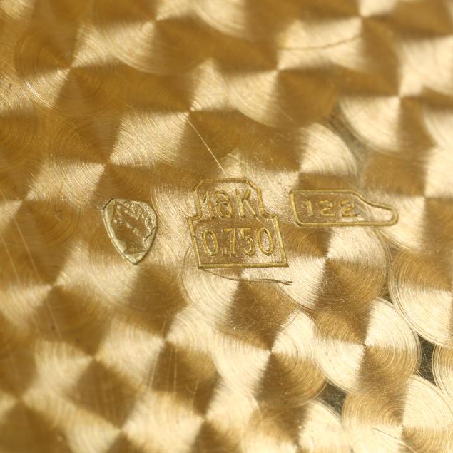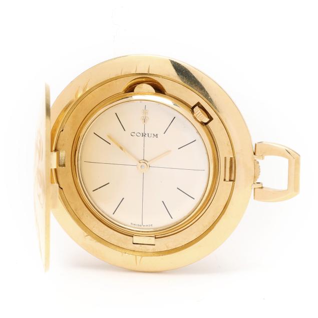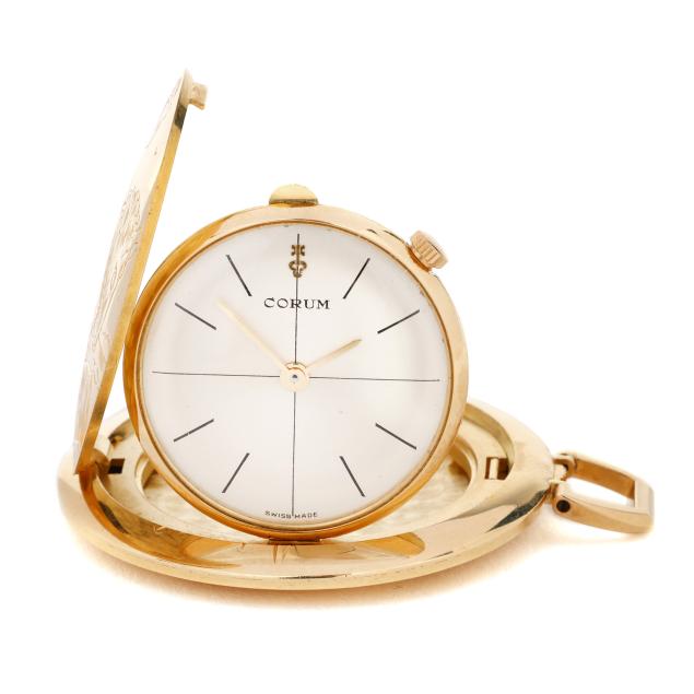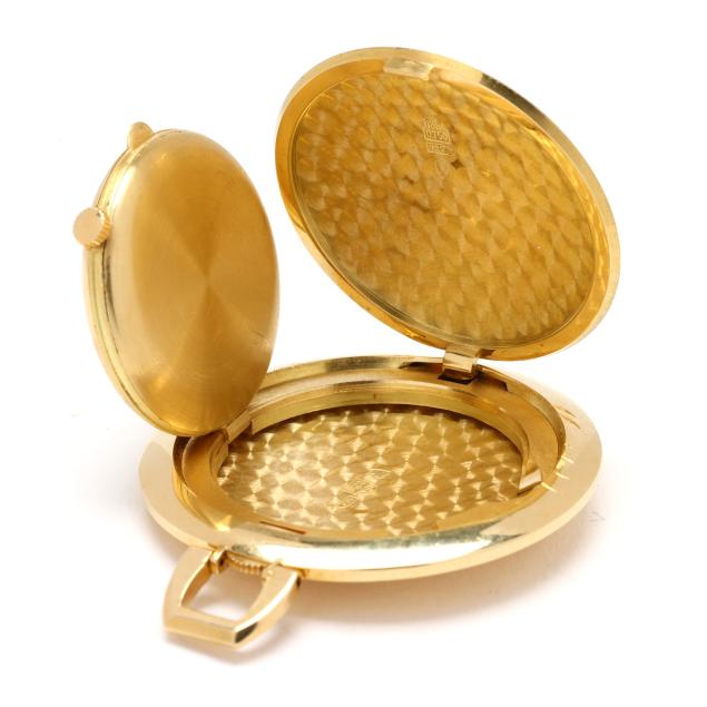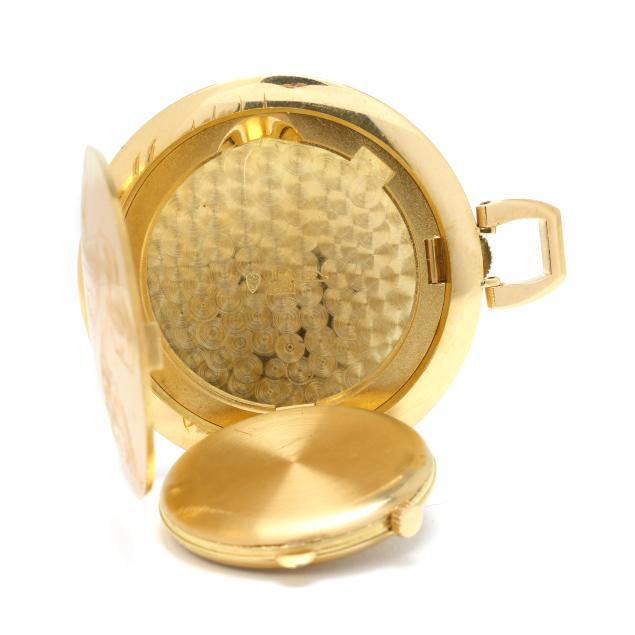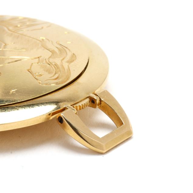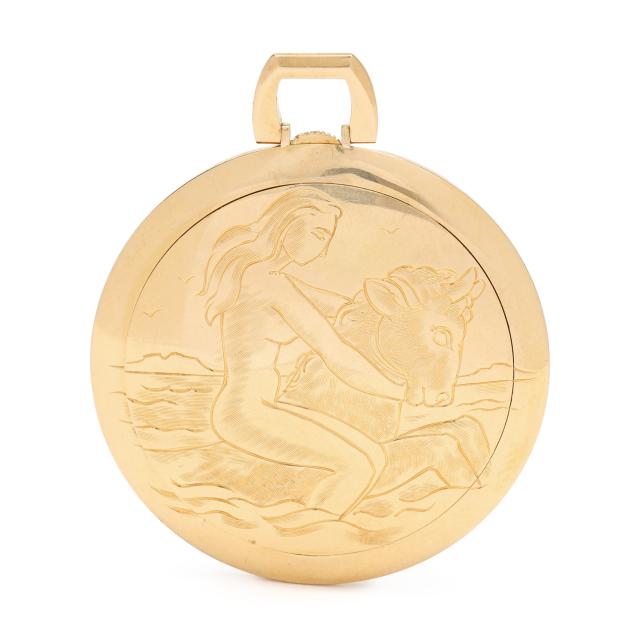 Manual wind, Aurore-Villeret 427, movement number 40519, the hunting-style gold case with depictions of Europa and the Bull to the obverse and Leda and the Swan to the reverse, opening to a swing-out watch dial, the signed silver-tone watch dial with black stick hour markers and gold-tone stick hands, the case with Swiss hallmarks for 18KT.