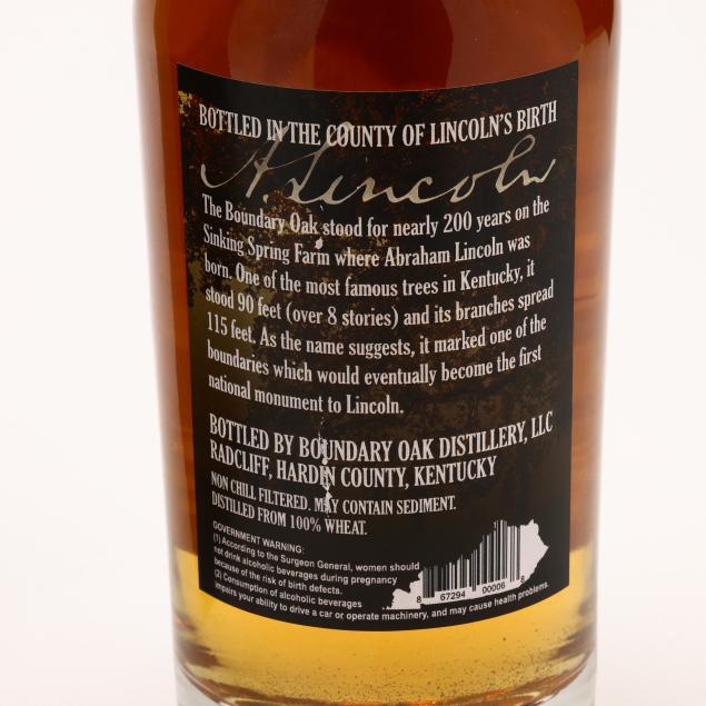 NV, Lincoln Grain Spirits from Boundary Oak Distillery, Radcliff, Hardin County, Kentucky, 54%, bottle no. 119 with cork adorned with wood from the Boundary Oak Tree from Abraham Lincoln's birthplace in Hodgenville KY, bn, sealed, includes wood presentation case (1 750 ml)