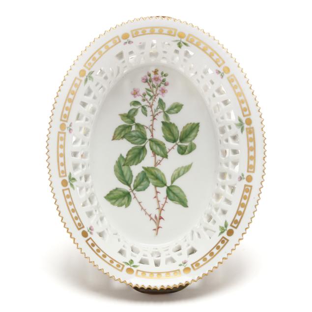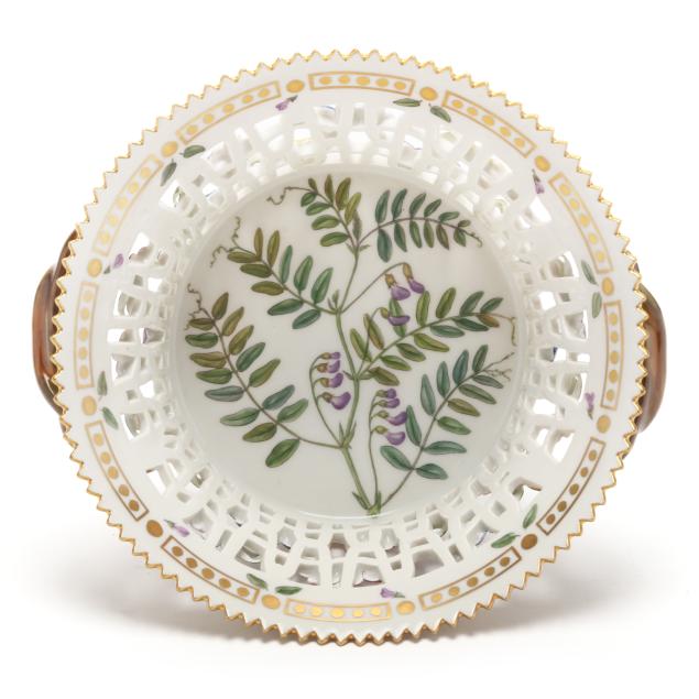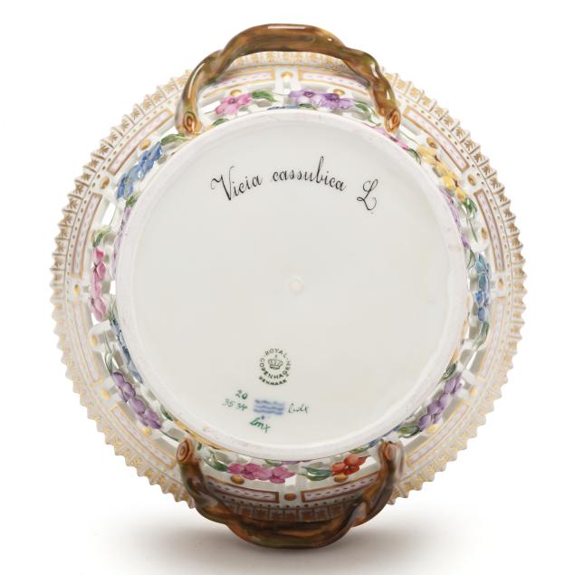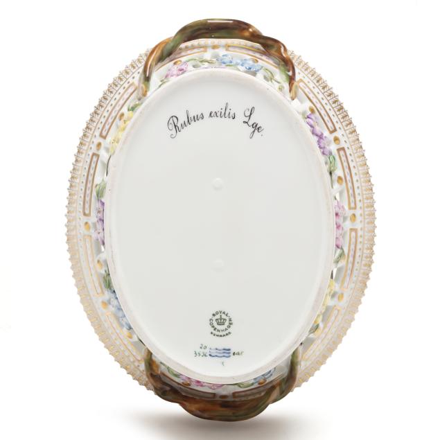 Denmark, 1969-1973, hand-painted and gilt porcelain, shape no. 3534 (round 3 1/2 x 9 x 8 3/8 in.) and 3536 (oval 3 1/4 x 7 1/2 x 9 3/4 in.), pattern no. 20, both marked with green printed and blue wave factory marks with Latin botanical specimen name to the underside, reticulated flared forms with sculptural branch form handles and floral vining, decorated Vicia cassubica L. and Rubus exilis Lge. respectively.