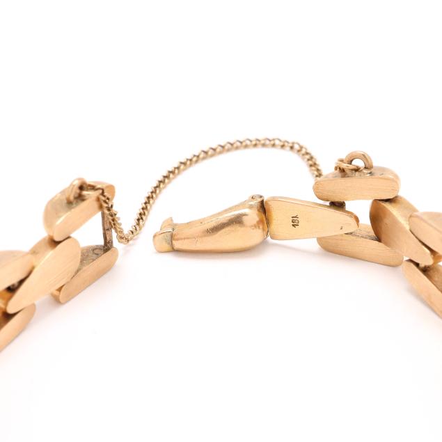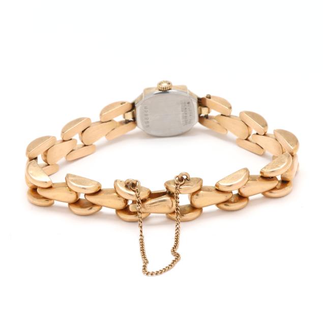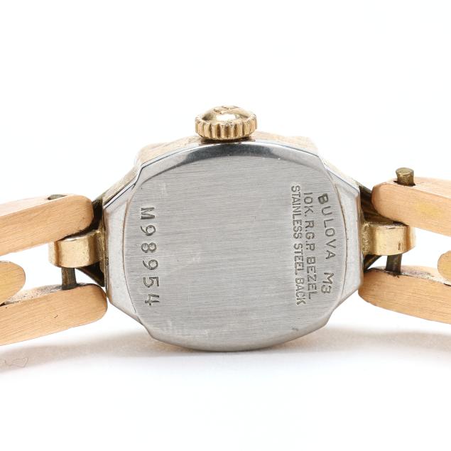 Circa 1963, manual wind, Bulova 5AR, case number M98954, the navette-shaped rolled gold-plated case with engraved detailing to lugs, the signed silver-tone dial with gold-tone Arabic numeral hour markers and gold-tone sword hands, the gold link bracelet completed with a fold-over clasp stamped 18K and safety chain, the caseback signed and stamped 10K RGP Bezel / Stainless Steel Back / M98954, bracelet testing 18KT.