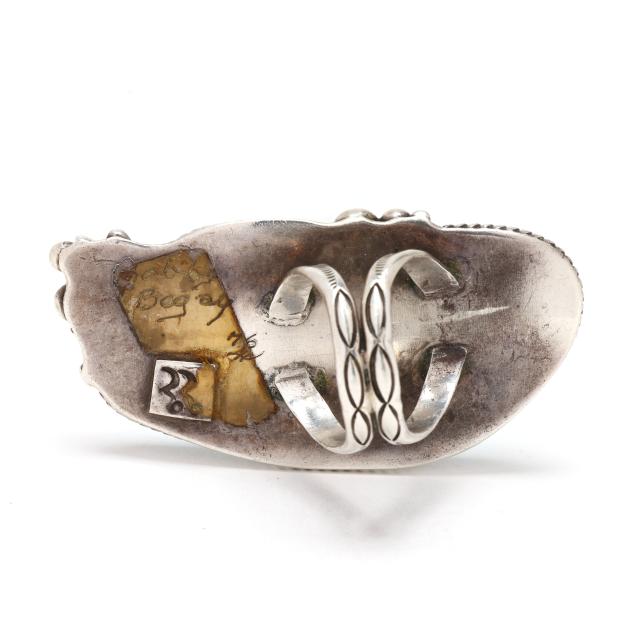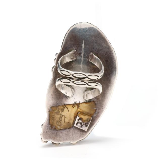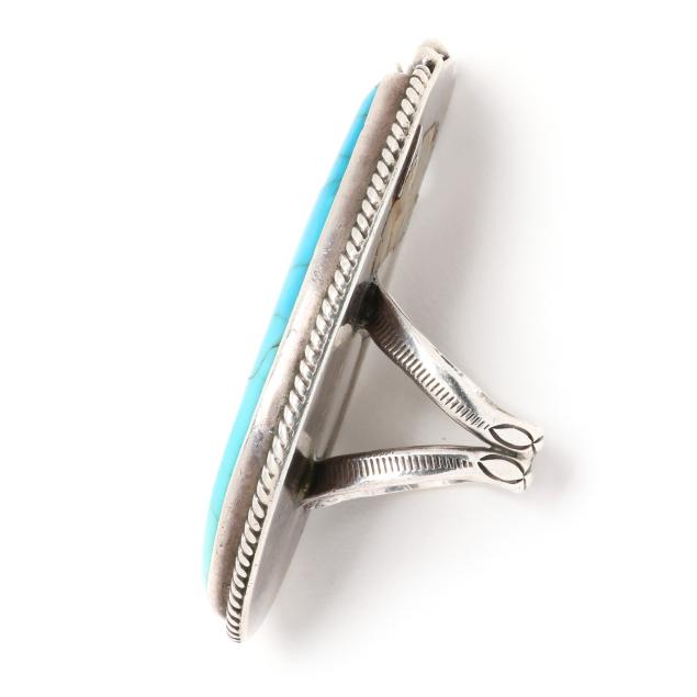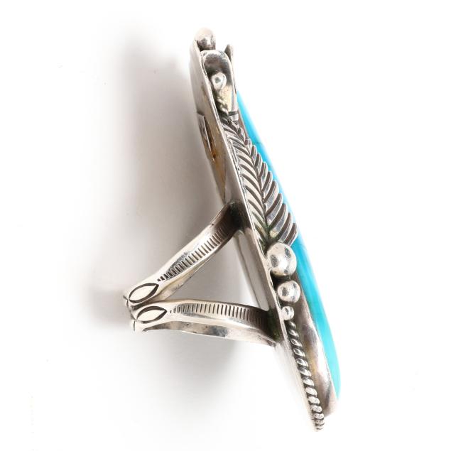 The large silver ring bezel set with a polished turquoise, with feather and squash blossom motif to surround, signed Bobby Begay and dated 76, testing silver.