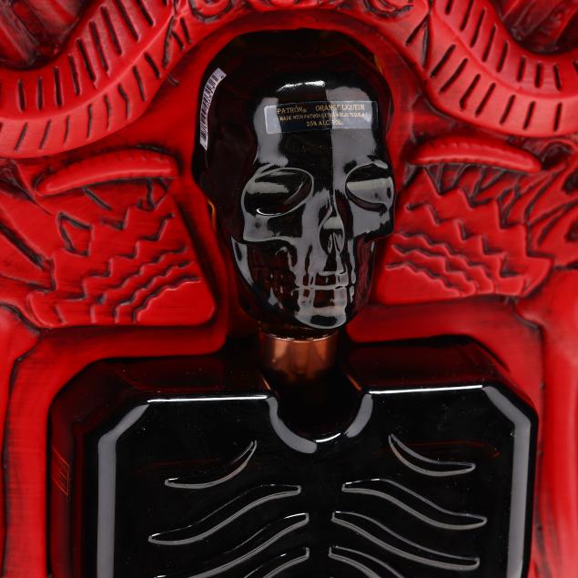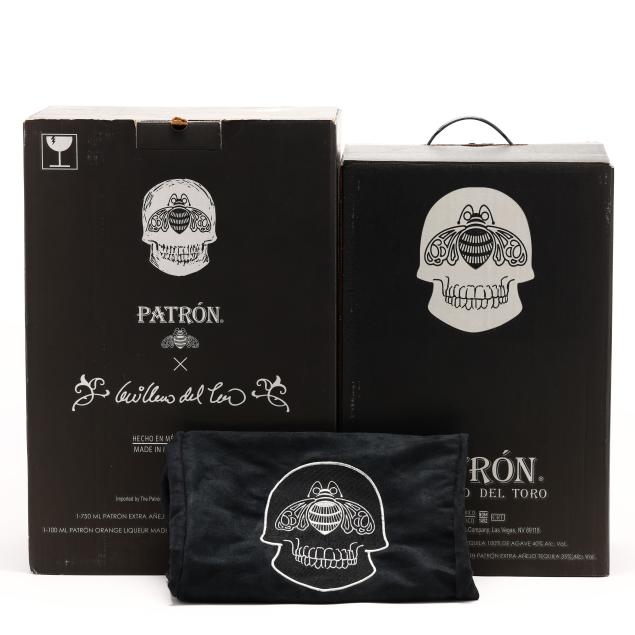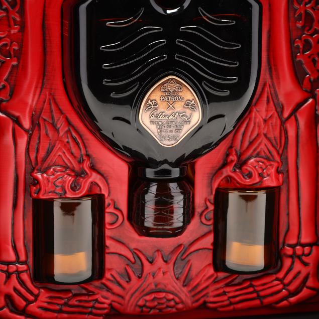 NV, Patron x Guillermo del Toro Tequila Extra Anejo, Mexico, 40%, limited release, bottle no. 5179 PSM, includes full sealed decanter bottle of tequila and smaller 100ml skull decanter with patron orange liqueur, includes original 'altar' presentation case, black velvet bag, and 2 ocbs (1 750 ml)