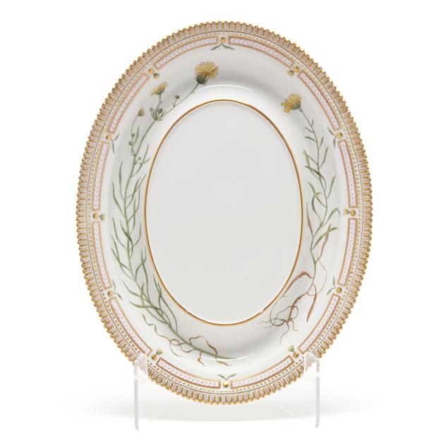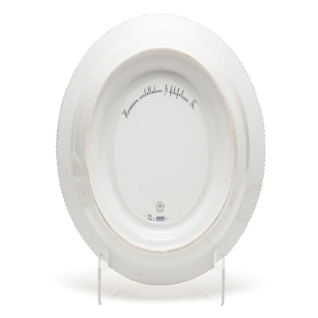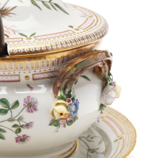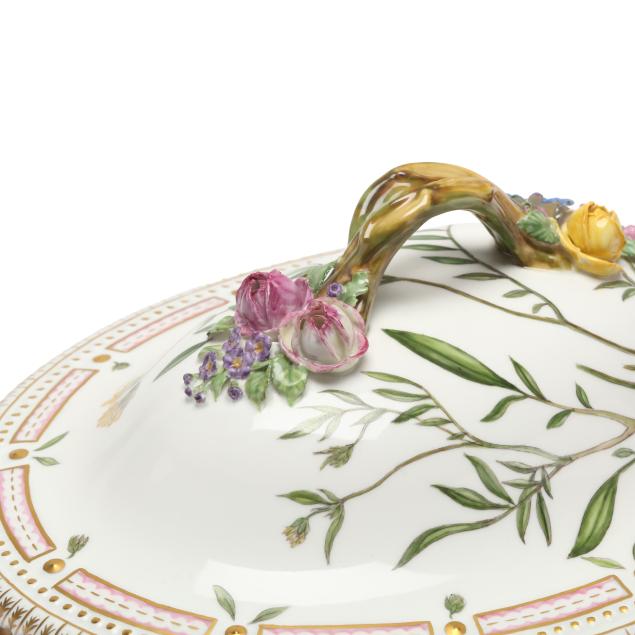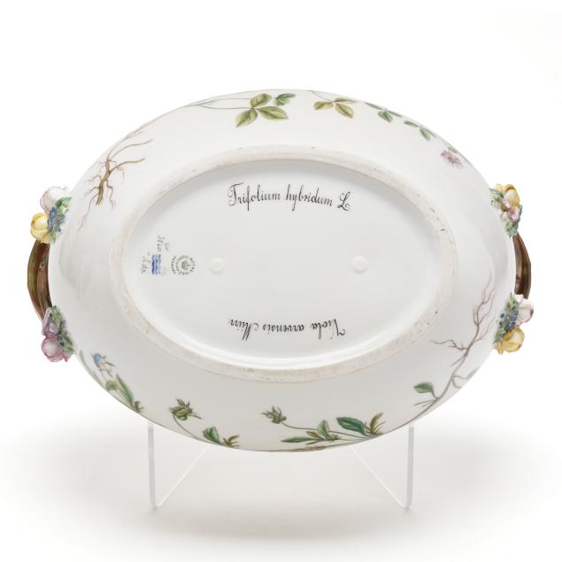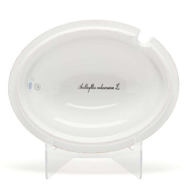 Denmark, hand-painted and gilt porcelain, marked with green printed and blue wave factory marks with Latin botanical specimen name to the underside, comprising a large 5 qt. double handled oval tureen and cover with floral branch form handles, shape number 3560, pattern no. 20, 1969-1973 date marks, the tureen decorated in Trifolium hybridum L. and Viola arvensis Murr. (6 x 14 3/8 x 10 in.), the cover in Anthyllis vulneraria L. (4 1/4 x 12 5/8 x 9 3/4 in.).