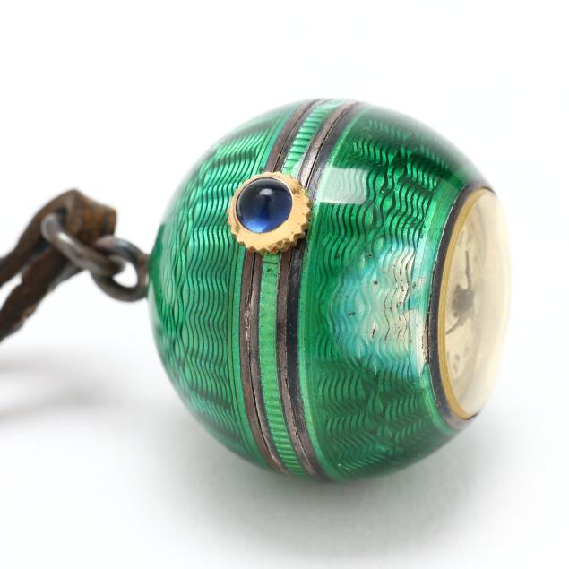 1929, manual wind, case number 1716, the sterling silver spherical case with green guilloché enamel, the cream dial with black Arabic numeral hour markers and blued steel modern hands, suspended from a leather brooch completed with a single pin stem, the case with Edinburgh sterling silver import hallmarks and maker's mark AK, movement signed Selci.