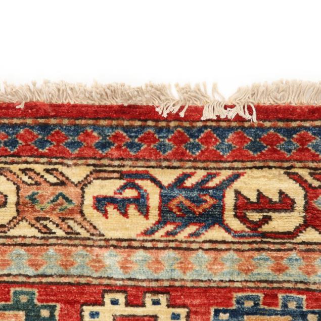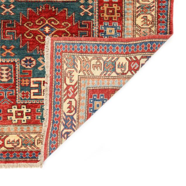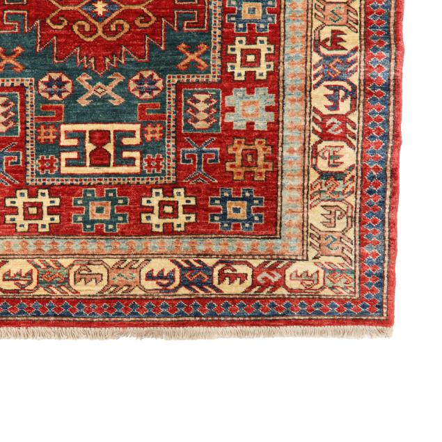 Wool on cotton foundation, contemporary, the sea green field with tan square to center and flanking red medallions surrounded by geometric motifs, the red outer field with hatch-mark motifs in blues, tans, and greens, the main tan border with scrolling stylized foliate motifs with S and E motifs, within minor reciprocal borders.