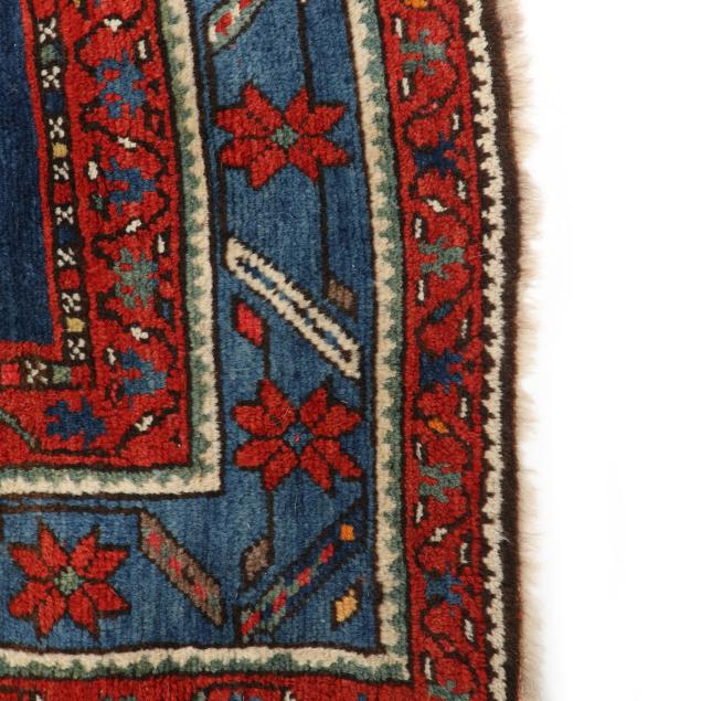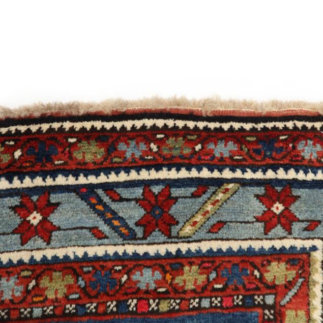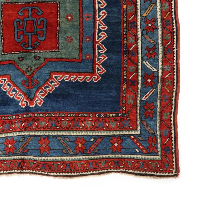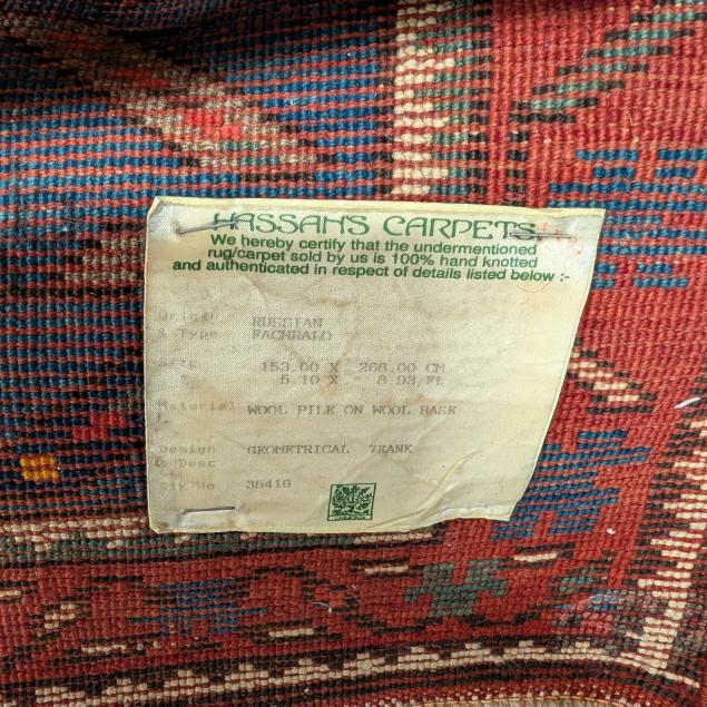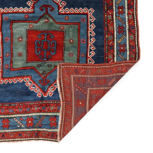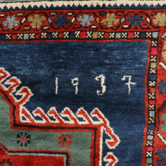 Wool on wool foundation, Russia, the blue field with center latched diamond medallion flanked by large latched-edge rectangular compartments, each with a stylized ram's horn motif, the main blue border with repeating floral motifs, within minor borders, the field signed twice with "1937," label to verso indicates made in Russia.